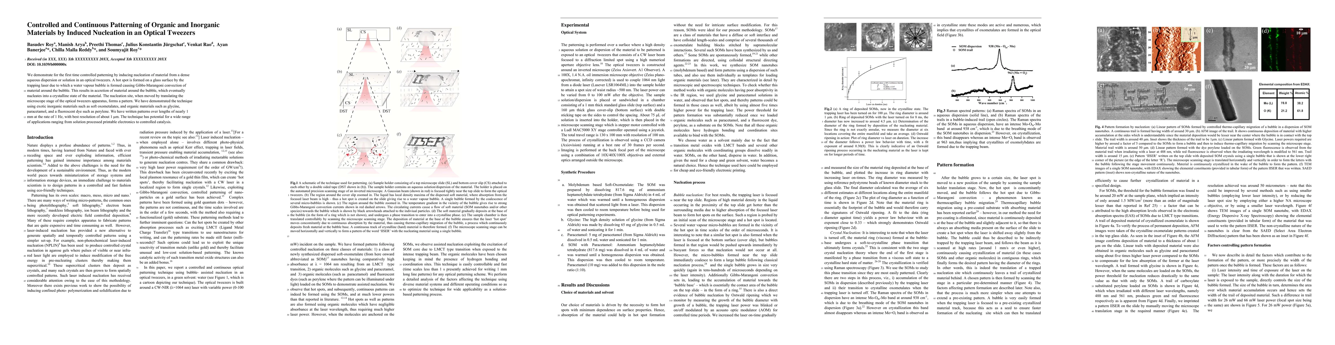 This paper presents a novel method for controlled patterning of organic and inorganic materials using induced nucleation within an optical tweezers setup, achieving patterns over 1 mm with a resolution of 1 micron. The technique leverages Gibbs-Marangoni convection to form crystalline structures, with potential applications in printable electronics and catalysis.