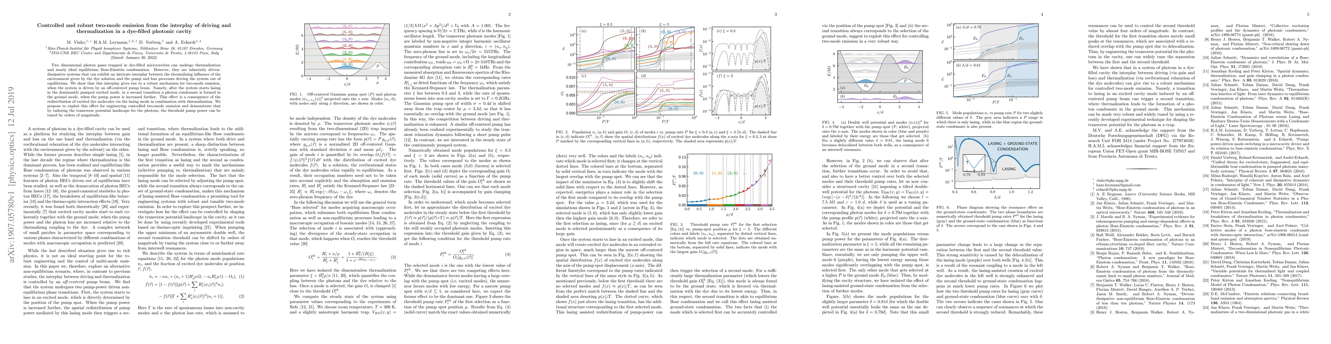 Two dimensional photon gases trapped in dye-filled microcavities can undergo thermalization and nearly ideal equilibrium Bose-Einstein condensation. However, they are inherently driven-dissipative systems that can exhibit an intricate interplay between the thermalizing influence of the environment given by the dye solution and the pump and loss processes driving the system out of equilibrium. We show that this interplay gives rise to a robust mechanism for two-mode emission, when the system is driven by an off-centered pump beam. Namely, after the system starts lasing in the dominantly pumped excited mode, in a second transition a photon condensate is formed in the ground mode, when the pump power is increased further. This effect is a consequence of the redistribution of excited dye molecules via the lasing mode in combination with thermalization. We propose to exploit this effect for engineering controlled two-mode emission and demonstrate that by tailoring the transverse potential landscape for the photons, the threshold pump power can be tuned by orders of magnitude.
