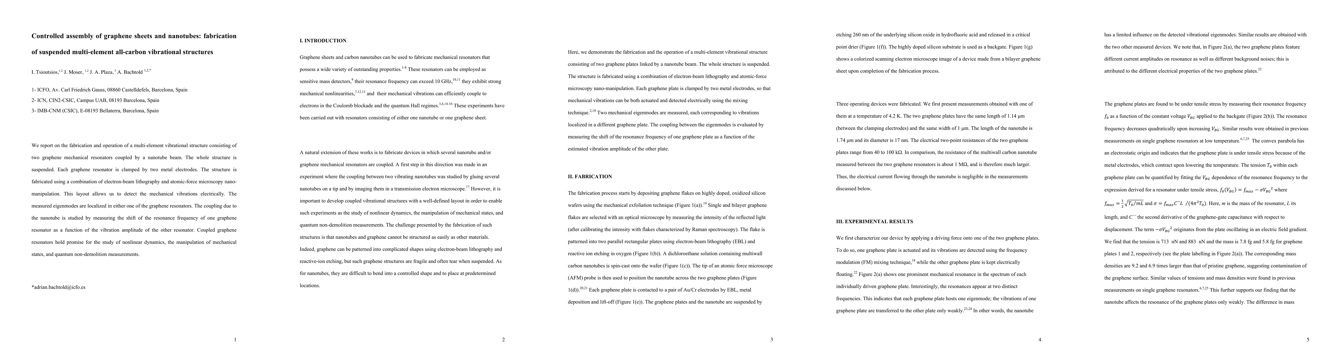 This paper details the fabrication of a suspended multi-element all-carbon vibrational structure using graphene sheets and nanotubes, employing electron-beam lithography and atomic-force microscopy. The study investigates the mechanical coupling between graphene resonators via a nanotube beam, with potential applications in nonlinear dynamics and quantum measurements.