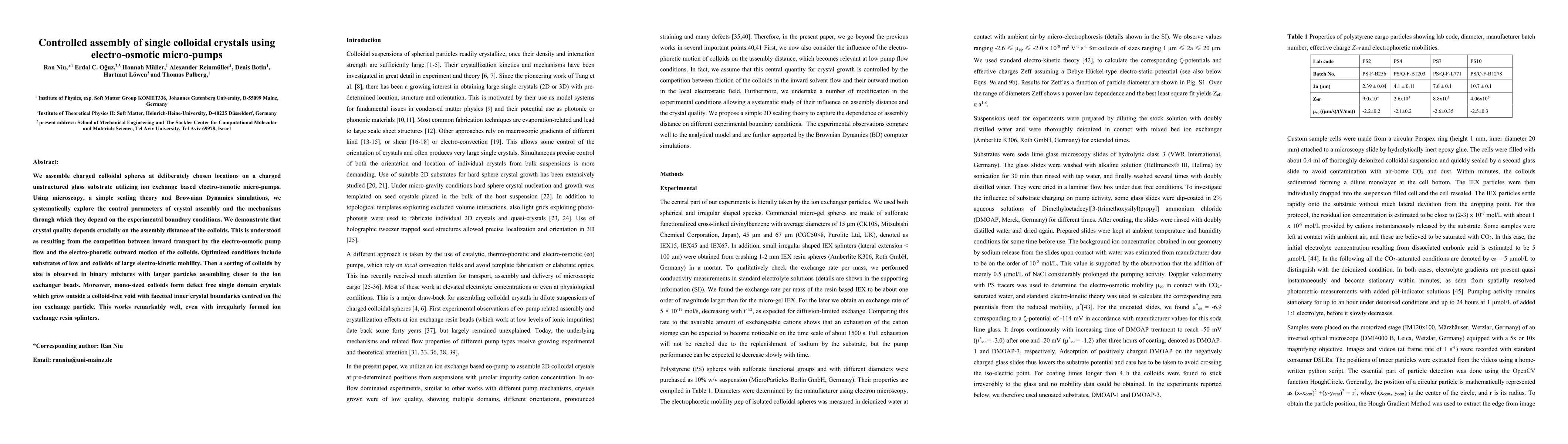 This study demonstrates the controlled assembly of single colloidal crystals using electro-osmotic micro-pumps, showing that crystal quality hinges on the assembly distance, with optimized conditions favoring low substrate charge and high colloid mobility. Mono-sized colloids form defect-free crystals, and size sorting occurs in binary mixtures.