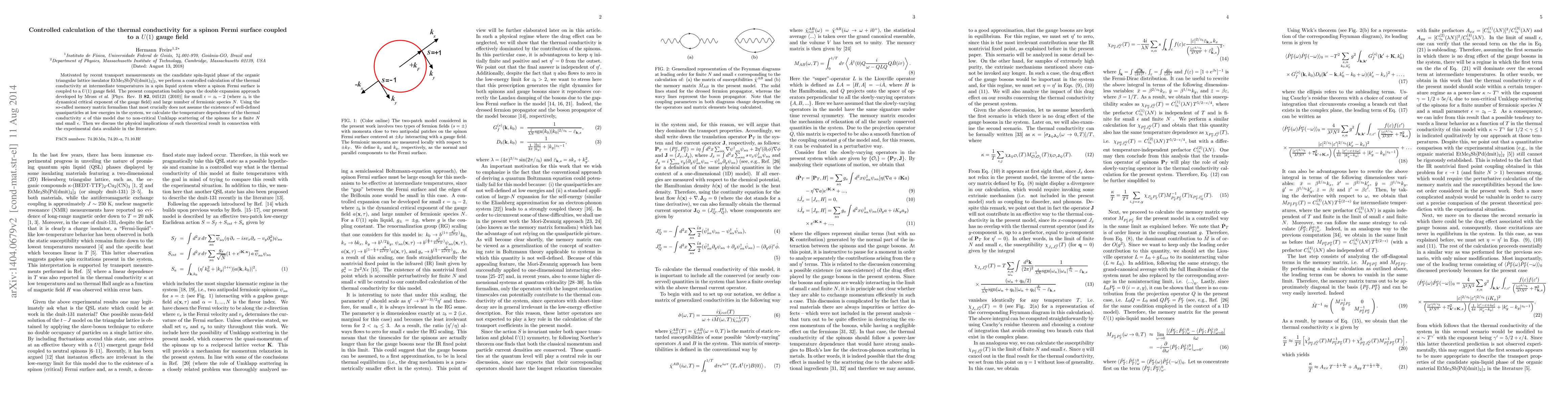 Motivated by recent transport measurements on the candidate spin-liquid phase of the organic triangular lattice insulator EtMe$_3$Sb[Pd(dmit)$_2$]$_2$, we perform a controlled calculation of the thermal conductivity at intermediate temperatures in a spin liquid system where a spinon Fermi surface is coupled to a $U(1)$ gauge field. The present computation builds upon the double expansion approach developed by Mross \emph{et al.} [Phys. Rev. B \textbf{82}, 045121 (2010)] for small $\epsilon=z_b -2$ (where $z_b$ is the dynamical critical exponent of the gauge field) and large number of fermionic species $N$. Using the so-called memory matrix formalism that most crucially does not assume the existence of well-defined quasiparticles at low energies in the system, we calculate the temperature dependence of the thermal conductivity $\kappa$ of this model due to non-critical Umklapp scattering of the spinons for a finite $N$ and small $\epsilon$. Then we discuss the physical implications of such theoretical result in connection with the experimental data available in the literature.