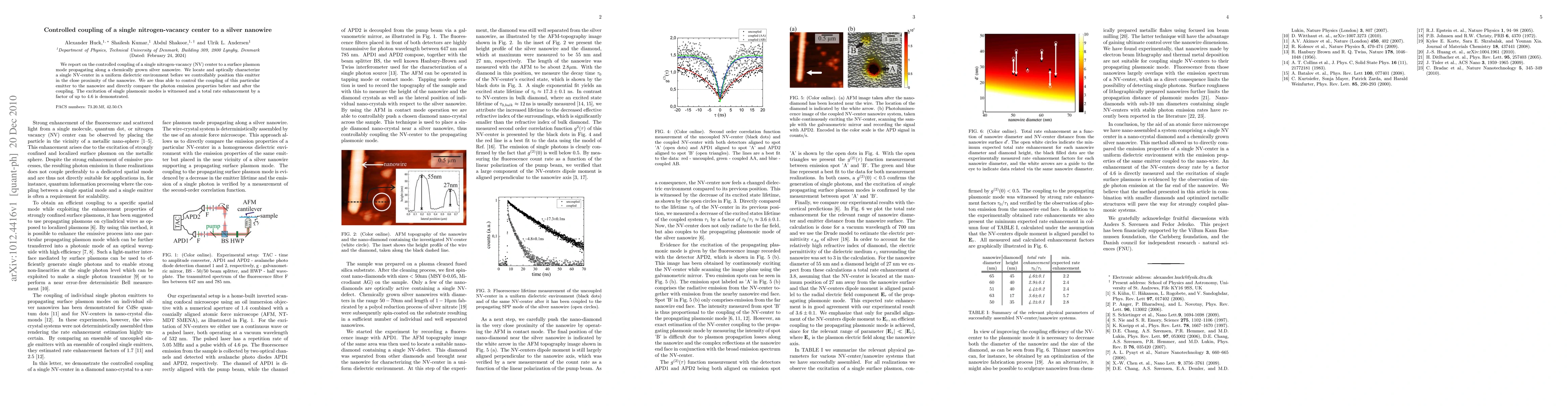 This paper details the controlled coupling of a single nitrogen-vacancy center to a silver nanowire's surface plasmon mode, achieving a photon emission rate enhancement of up to 4.6 times. The study precisely positions the NV center near the nanowire to observe and compare its emission properties before and after coupling.
