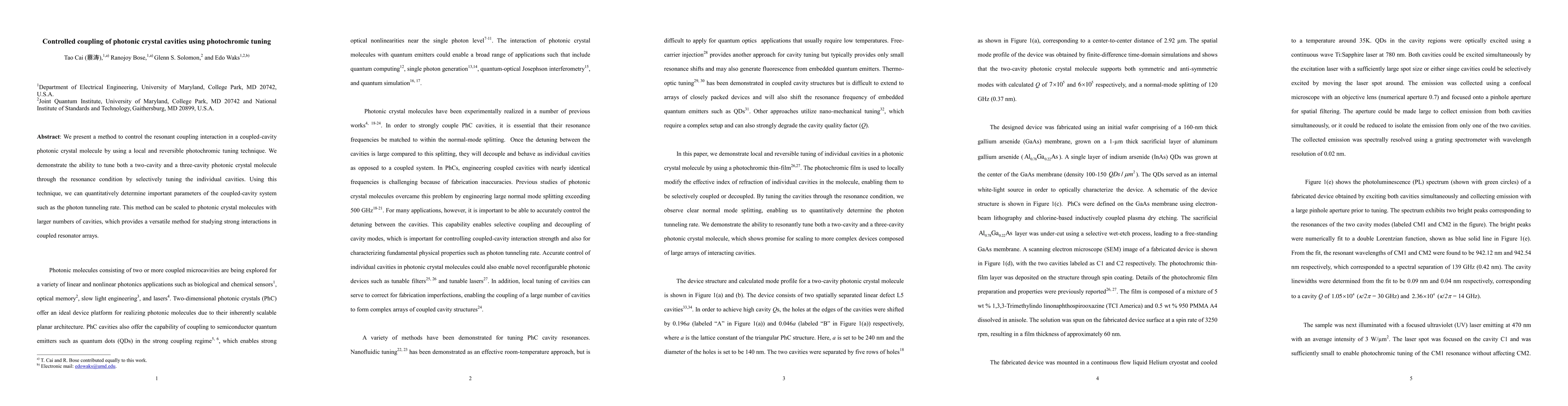 This paper introduces a photochromic tuning technique to control the coupling interaction in photonic crystal cavities, demonstrating tunable resonance in both two-cavity and three-cavity systems and enabling the measurement of photon tunneling rates. The scalable method holds promise for studying strong interactions in larger coupled resonator arrays.