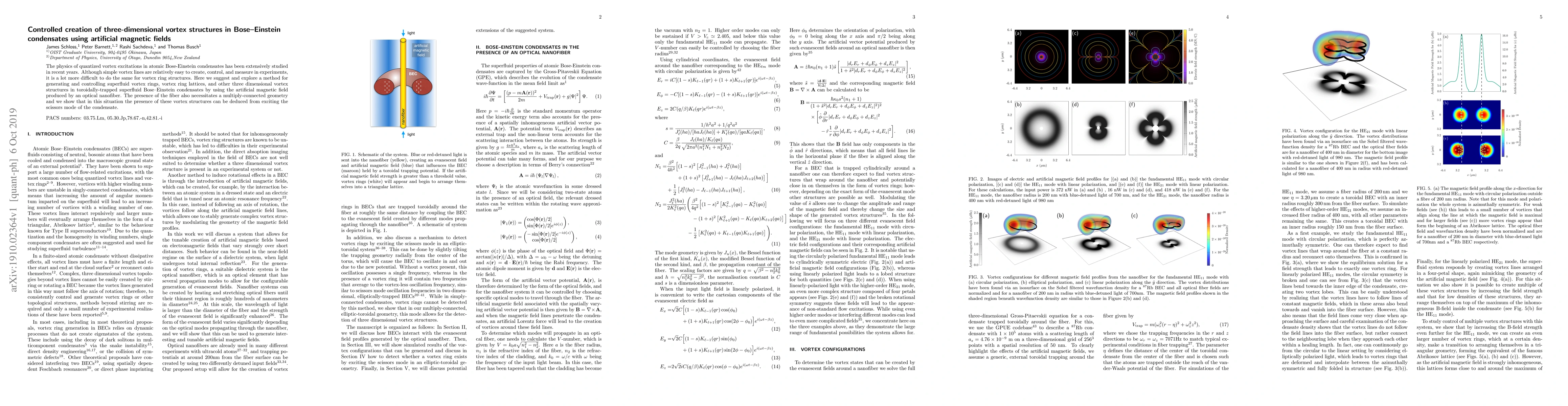 The paper presents a method for generating and controlling three-dimensional vortex structures using artificial magnetic fields around optical nano-fibers, along with a technique for detecting vortex rings via the scissors mode of the condensate.