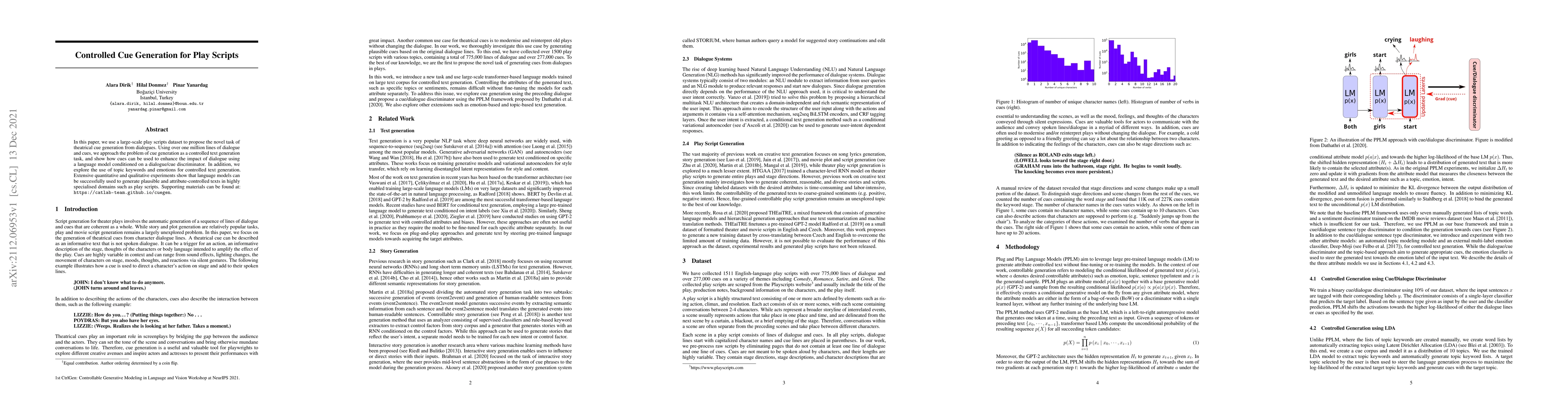 This paper introduces a novel task of generating cues from play scripts using a large dataset, framing it as controlled text generation. The study demonstrates the effectiveness of language models conditioned on dialogue/cue discriminators for generating plausible and attribute-controlled cues in specialized domains.