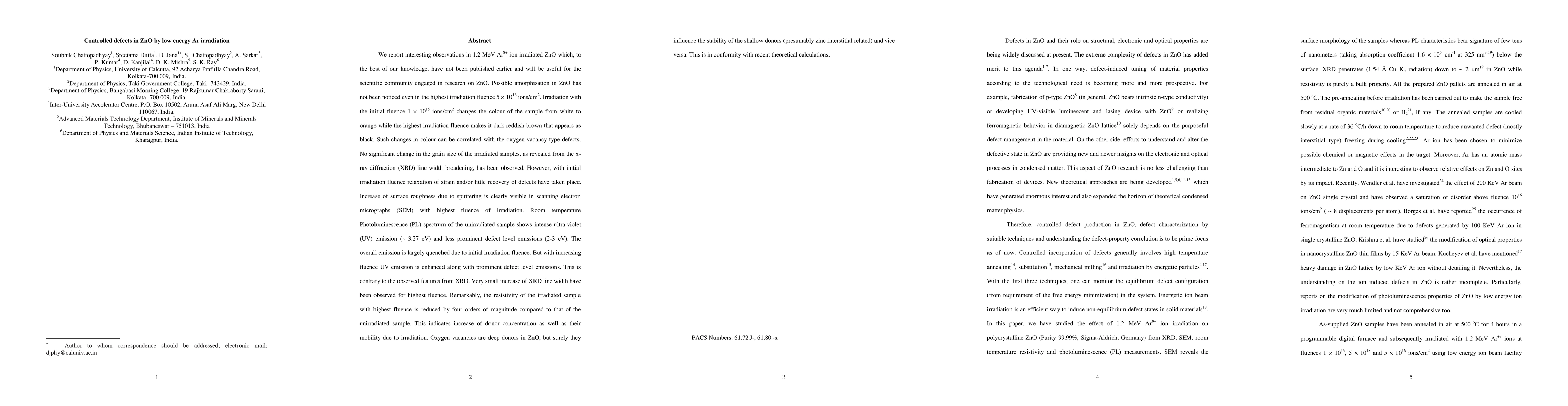 This study investigates the effects of low-energy Ar ion irradiation on ZnO, revealing significant color changes and defect formation, particularly oxygen vacancies, without altering grain size. The resistivity decreases drastically, indicating enhanced donor concentration and mobility due to irradiation-induced defects.