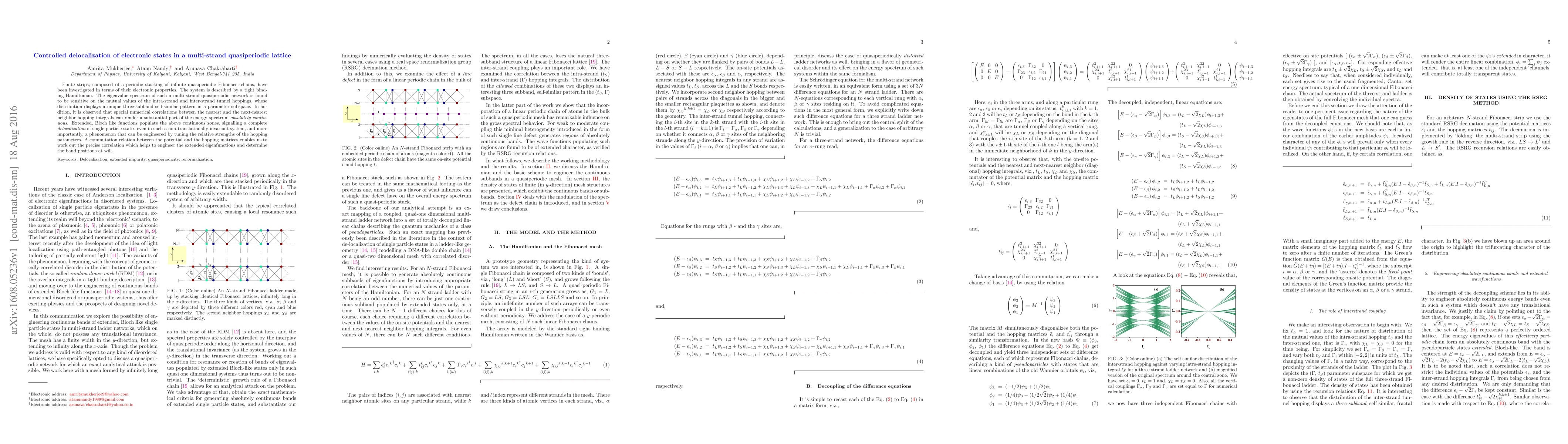Finite strips, composed of a periodic stacking of infinite quasiperiodic Fibonacci chains, have been investigated in terms of their electronic properties. The system is described by a tight binding Hamiltonian. The eigenvalue spectrum of such a multi-strand quasiperiodic network is found to be sensitive on the mutual values of the intra-strand and inter-strand tunnel hoppings, whose distribution displays a unique three-subband self-similar pattern in a parameter subspace. In addition, it is observed that special numerical correlations between the nearest and the next-nearest neighbor hopping integrals can render a substantial part of the energy spectrum absolutely continuous. Extended, Bloch like functions populate the above continuous zones, signalling a complete delocalization of single particle states even in such a non-translationally invariant system, and more importantly, a phenomenon that can be engineered by tuning the relative strengths of the hopping parameters. A commutation relation between the potential and the hopping matrices enables us to work out the precise correlation which helps to engineer the extended eigenfunctions and determine the band positions at will.