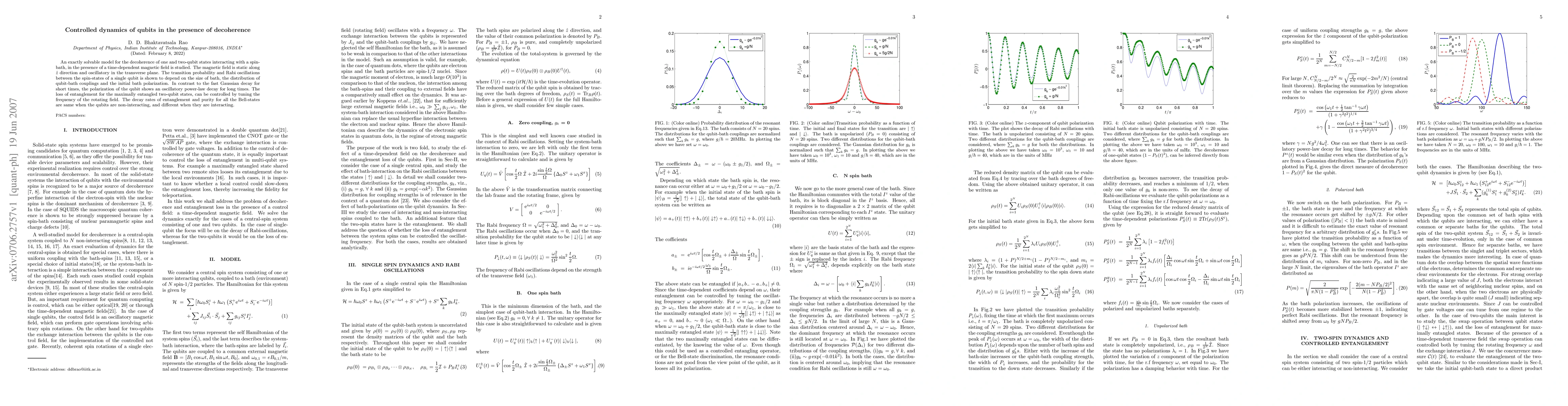 An exactly solvable model for the decoherence of one and two-qubit states interacting with a spin-bath, in the presence of a time-dependent magnetic field is studied. The magnetic field is static along $\hat{z}$ direction and oscillatory in the transverse plane. The transition probability and Rabi oscillations between the spin-states of a single qubit is shown to depend on the size of bath, the distribution of qubit-bath couplings and the initial bath polarization. In contrast to the fast Gaussian decay for short times, the polarization of the qubit shows an oscillatory power-law decay for long times. The loss of entanglement for the maximally entangled two-qubit states, can be controlled by tuning the frequency of the rotating field. The decay rates of entanglement and purity for all the Bell-states are same when the qubits are non-interacting, and different when they are interacting.