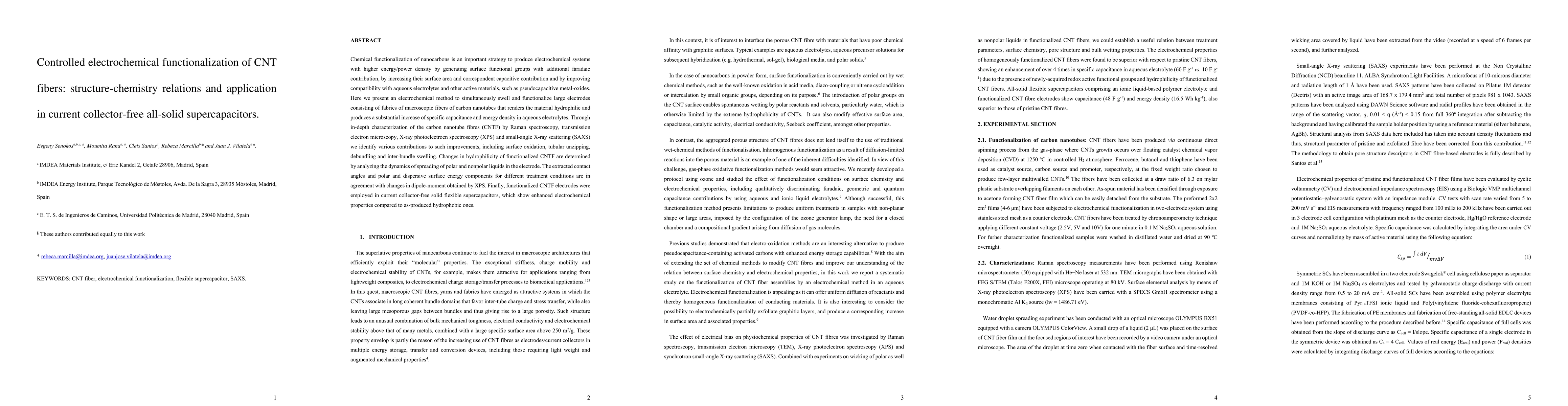 Chemical functionalization of nanocarbons is an important strategy to produce electrochemical systems with higher energy/power density by generating surface functional groups with additional faradaic contribution, by increasing their surface area and correspondent capacitive contribution and by improving compatibility with aqueous electrolytes and other active materials, such as pseudocapacitive metal-oxides. Here we present an electrochemical method to simultaneously swell and functionalize large electrodes consisting of fabrics of macroscopic fibers of carbon nanotubes that renders the material hydrophilic and produces a substantial increase of specific capacitance and energy density in aqueous electrolytes. Through in-depth characterization of the carbon nanotube fibres (CNTF) by Raman spectroscopy, transmission electron microscopy, X-ray photoelectrocn spectroscopy (XPS) and small-angle X-ray scattering (SAXS) we identify various contributions to such improvements, including surface oxidation, tubular unzipping, debundling and inter-bundle swelling. Changes in hydrophilicity of functionalized CNTF are determined by analyzing the dynamics of spreading of polar and nonpolar liquids in the electrode. The extracted contact angles and polar and dispersive surface energy components for different treatment conditions are in agreement with changes in dipole-moment obtained by XPS. Finally, functionalized CNTF electrodes were employed in current collector-free solid flexible supercapacitors, which show enhanced electrochemical properties compared to as-produced hydrophobic ones.