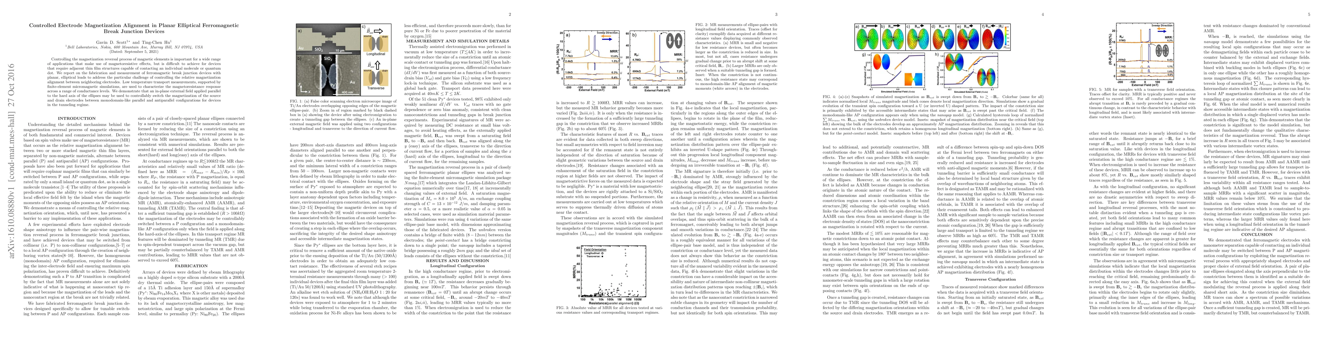This research details the creation and examination of ferromagnetic break junction devices with planar, elliptical electrodes. Using low-temperature measurements and micromagnetic simulations, the study shows that an external in-plane field can control the magnetization of source and drain electrodes, switching them between parallel and antiparallel configurations for tunneling regime devices.