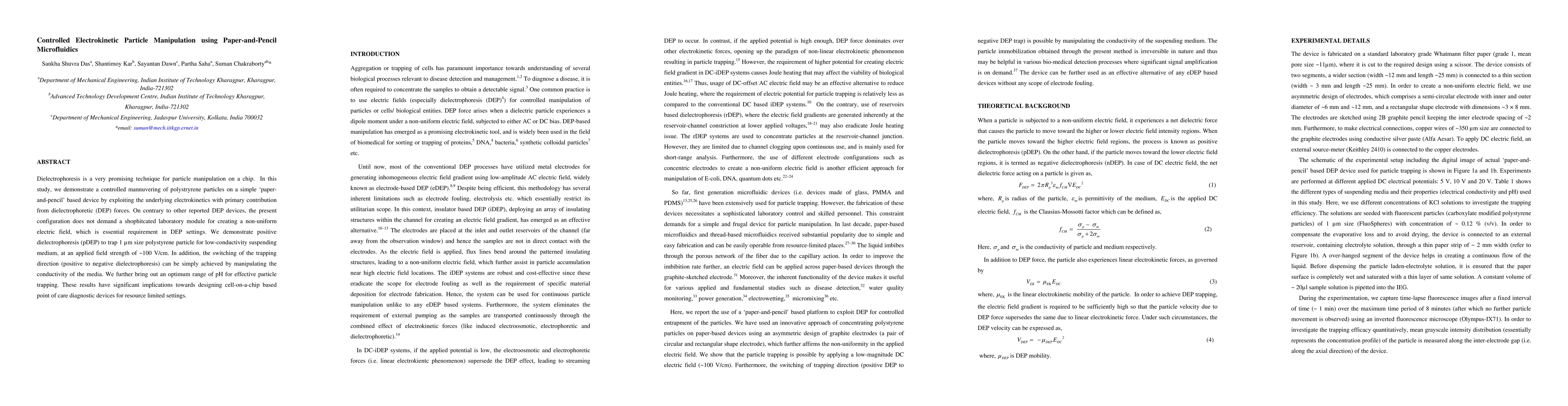 This study demonstrates controlled electrokinetic manipulation of polystyrene particles using a simple paper-and-pencil microfluidic device, leveraging dielectrophoretic forces without requiring complex laboratory setups. The device can switch trapping direction by adjusting medium conductivity, with implications for low-cost, point-of-care diagnostic devices.