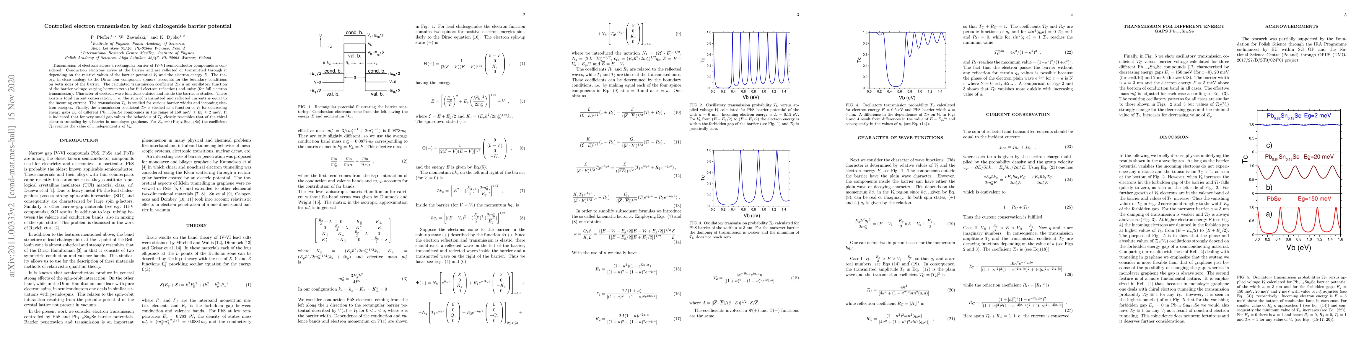 Transmission of electrons across a rectangular barrier of IV-VI semiconductor compounds is considered. Conduction electrons arrive at the barrier and are reflected or transmitted through it depending on the relative values of the barrier potential $V_b$ and the electron energy $E$. The theory, in close analogy to the Dirac four component spinors, accounts for the boundary conditions on both sides of the barrier. The calculated transmission coefficient $T_C$ is an oscillatory function of the barrier voltage varying between zero (for full electron reflection) and unity (for full electron transmission). Character of electron wave functions outside and inside the barrier is studied. There exists a total current conservation, i. e. the sum of transmitted and reflected currents is equal to the incoming current. The transmission $T_C$ is studied for various barrier widths and incoming electron energies. Finally, the transmission coefficient $T_C$ is studied as a function of $V_b$ for decreasing energy gaps $E_g$ of different Pb$_{1-x}$Sn$_x$Se compounds in the range of 150 meV $\geq E_g \geq$ 2 meV. It is indicated that for very small gap values the behaviour of $T_C$ closely resembles that of the chiral electron tunneling by a barrier in monolayer graphene. For $E_g$ =0 (Pb$_{0.81}$Sn$_{0.19}$Se) the coefficient $T_C$ reaches the value of 1 independently of $V_b$.