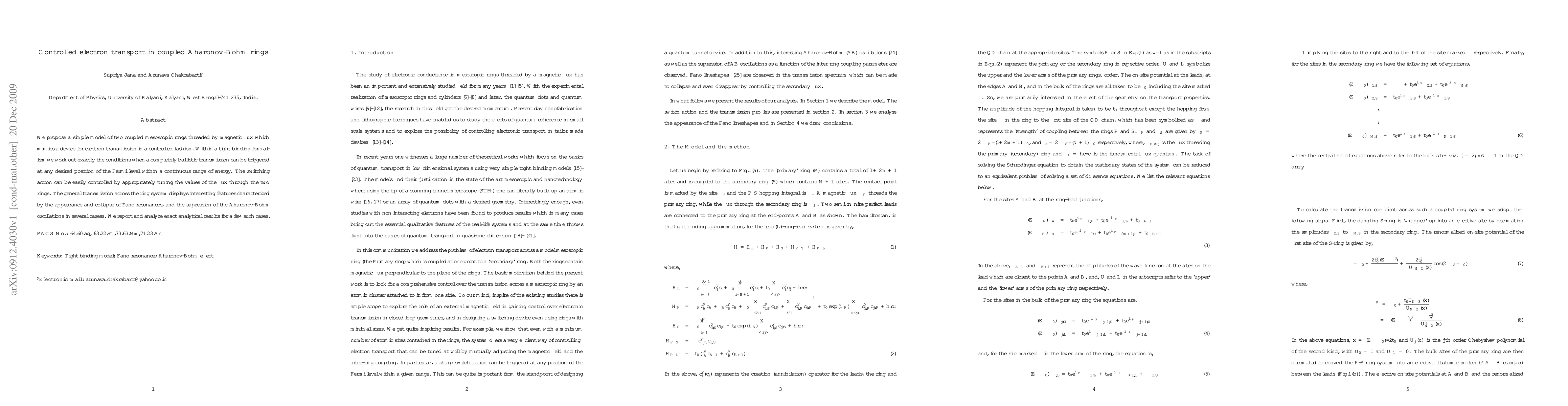 We propose a simple model of two coupled mesoscopic rings threaded by magnetic flux which mimics a device for electron transmission in a controlled fashion. Within a tight binding formalism we work out exactly the conditions when a completely ballistic transmission can be triggered at any desired position of the Fermi level within a continuous range of energy. The switching action can be easily controlled by appropriately tuning the values of the flux through the two rings. The general transmission across the ring system displays interesting features characterized by the appearance and collapse of Fano resonances, and the suppression of the Aharonov-Bohm oscillations in several cases. We report and analyze exact analytical results for a few such cases.
