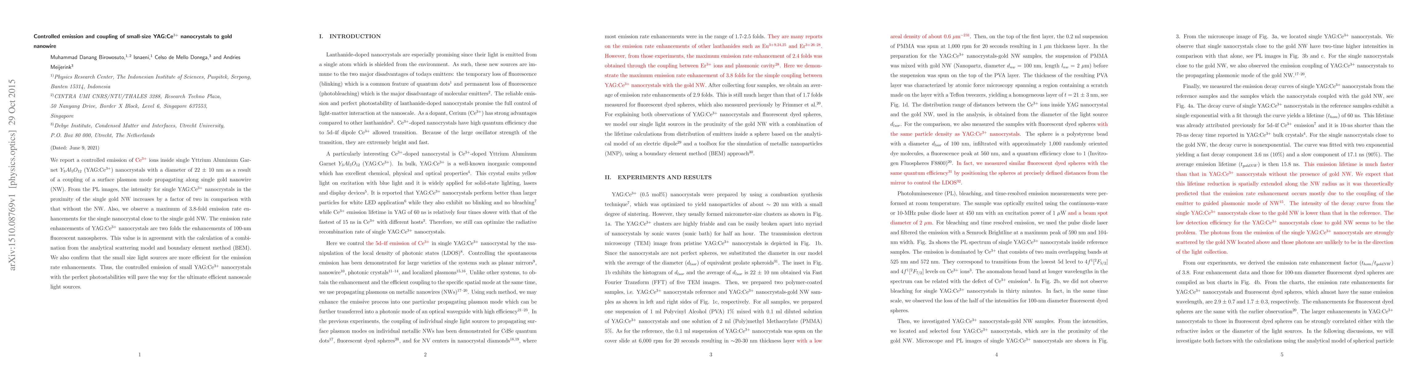 This paper reports the controlled emission enhancement of Ce3+ ions in YAG:Ce3+ nanocrystals via coupling with a gold nanowire, achieving a two-fold increase in emission intensity compared to without the nanowire. The study finds a 3.8-fold enhancement in emission rate for small nanocrystals, demonstrating the potential for efficient nanoscale light sources.