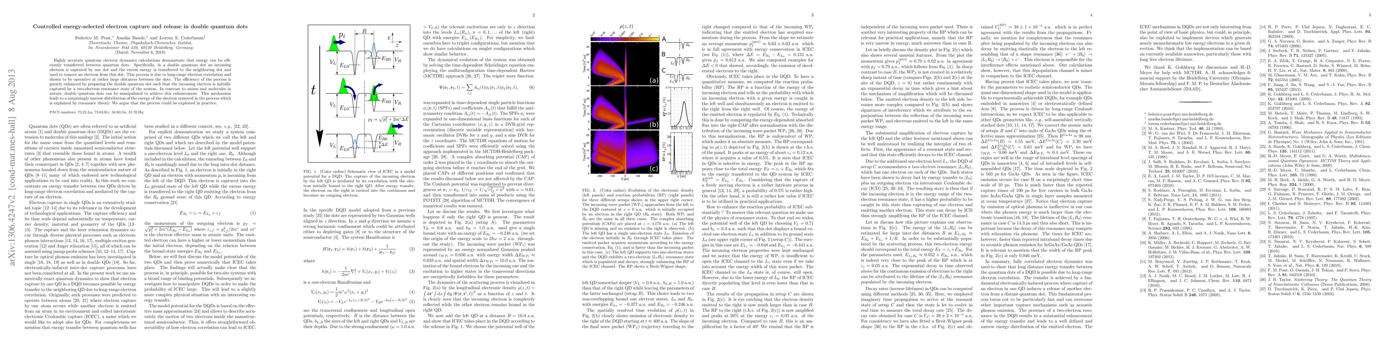This study demonstrates a highly efficient energy transfer between quantum dots via controlled electron capture and release, facilitated by long-range electron correlation and enhanced by specific resonance states. The process could potentially be utilized in practical applications due to its narrow energy distribution.