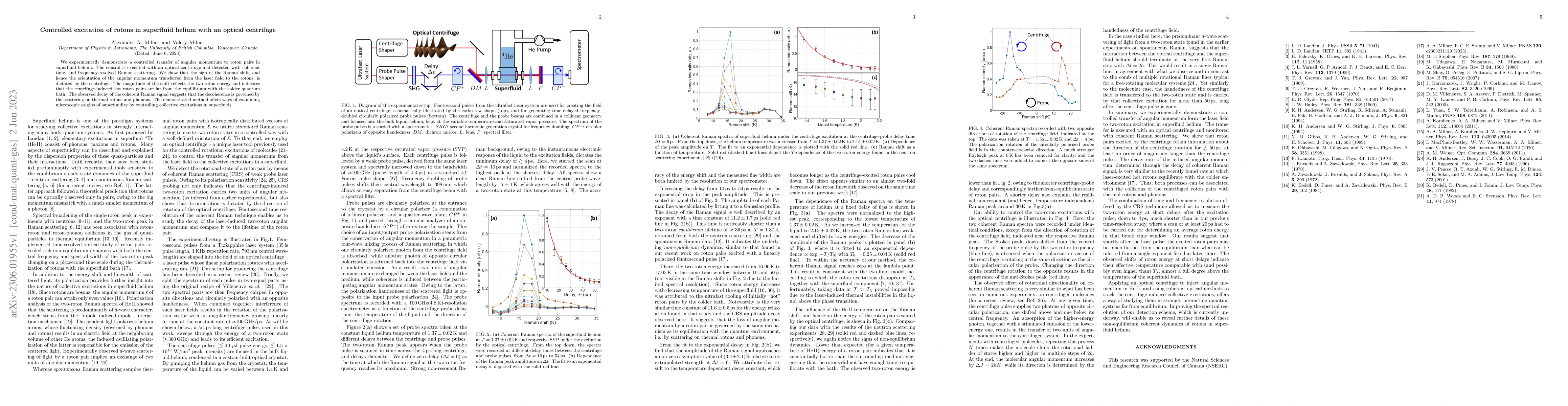 This paper demonstrates a method for controlled angular momentum transfer to roton pairs in superfluid helium using an optical centrifuge, with detection via Raman scattering. The technique reveals non-equilibrium states and suggests decoherence mechanisms, offering insights into the microscopic origins of superfluidity.