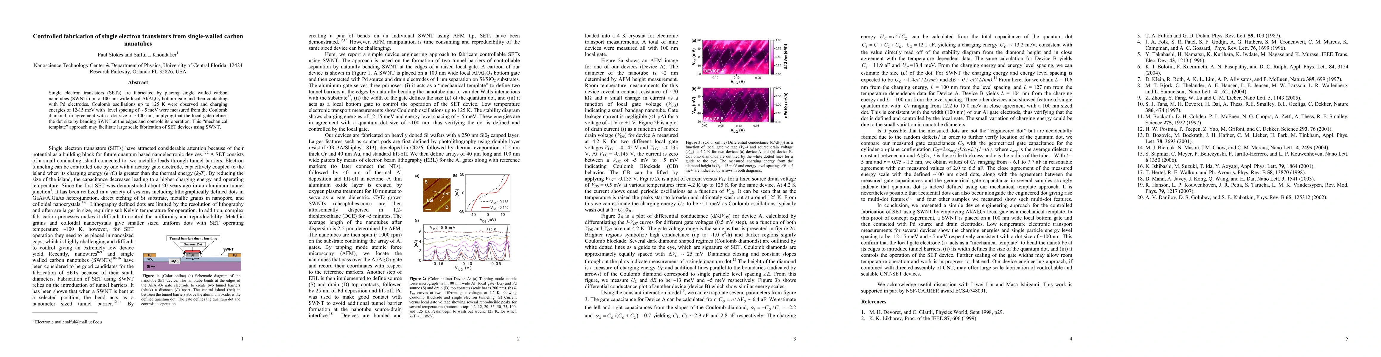 Single electron transistors (SETs) were successfully fabricated from single-walled carbon nanotubes using a "mechanical template" approach, demonstrating Coulomb oscillations and precise control over the dot size and charging energies. This method shows potential for scalable production of SET devices.