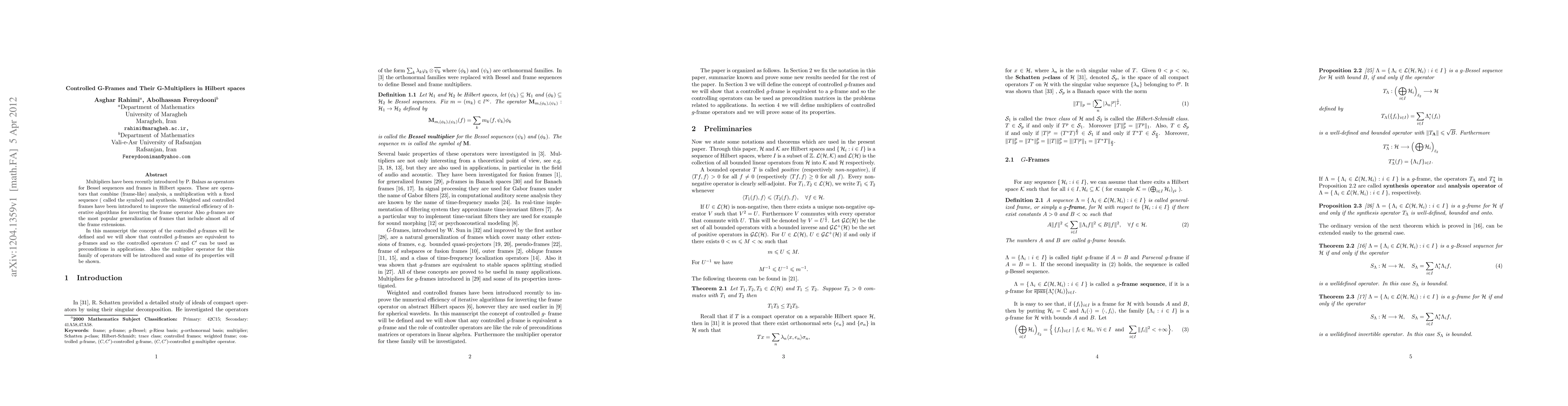 This paper defines controlled g-frames in Hilbert spaces, showing their equivalence to g-frames, and introduces controlled operators C and C0 as effective preconditioners. It also explores the multiplier operator for these frames and discusses some of its properties.