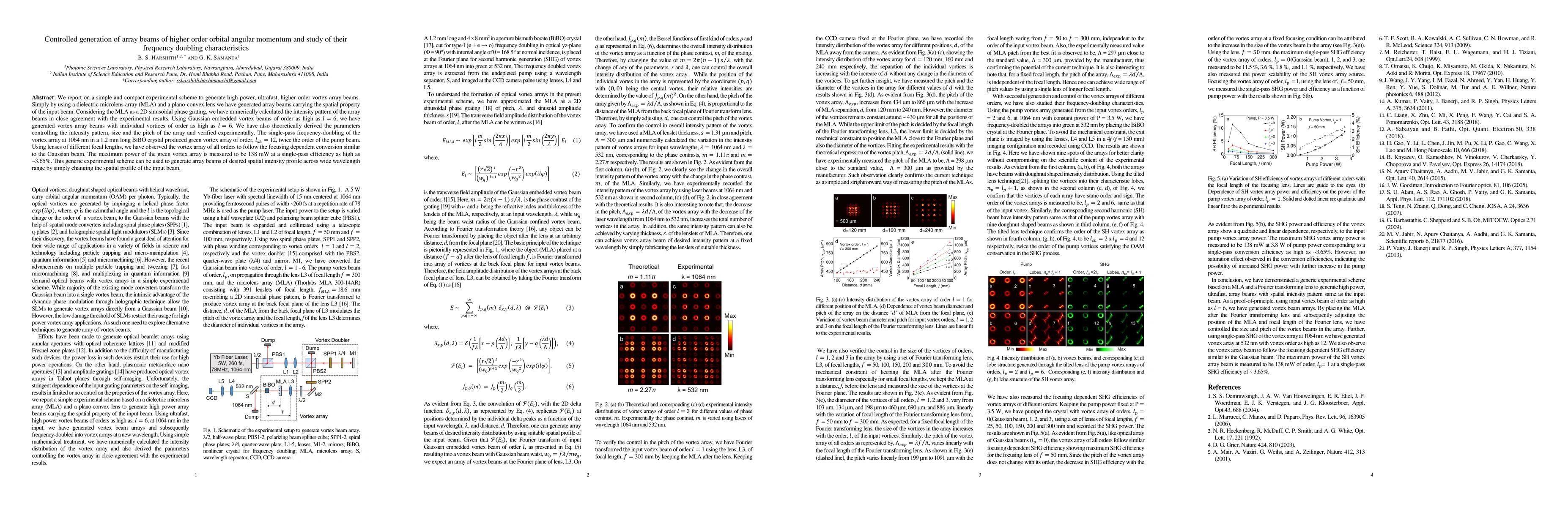 We report on a simple and compact experimental scheme to generate high power, ultrafast, higher order vortex array beams. Simply by using a dielectric microlens array (MLA) and a plano-convex lens we have generated array beams carrying the spatial property of the input beam. Considering the MLA as a 2D sinusoidal phase grating, we have numerically calculated the intensity pattern of the array beams in close agreement with the experimental results. Using Gaussian embedded vortex beams of order as high as l= 6, we have generated vortex array beams with individual vortices of order as high as l= 6. We have also theoretically derived the parameters controlling the intensity pattern, size and the pitch of the array and verified experimentally. The single-pass frequency-doubling of the vortex array at 1064 nm in a 1.2 mm long BiBO crystal produced green vortex array of order, l_sh= 12, twice the order of the pump beam. Using lenses of different focal lengths, we have observed the vortex array of all orders to follow the focusing dependent conversion similar to the Gaussian beam. The maximum power of the green vortex array is measured to be 138 mW at a single-pass efficiency as high as ~3.65%. This generic experimental scheme can be used to generate array beams of desired spatial intensity profile across wide wavelength range by simply changing the spatial profile of the input beam.