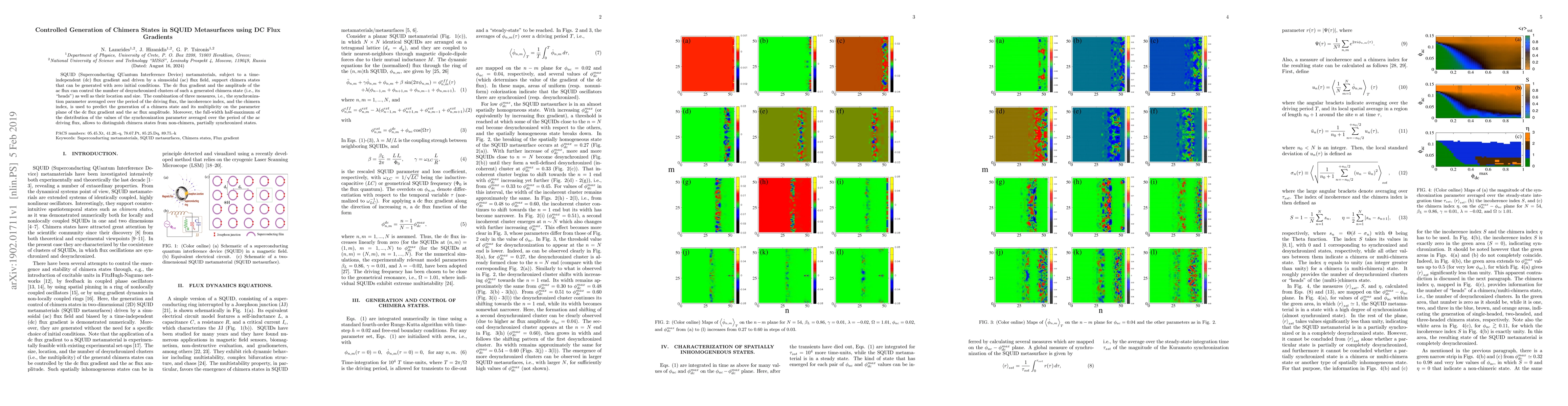 SQUID (Superconducting QUantum Interference Device) metamaterials, subject to a time-independent (dc) flux gradient and driven by a sinusoidal (ac) flux field, support chimera states that can be generated with zero initial conditions. The dc flux gradient and the amplitude of the ac flux can control the number of desynchronized clusters of such a generated chimera state (i.e., its `heads') as well as their location and size. The combination of three measures, i.e., the synchronization parameter averaged over the period of the driving flux, the incoherence index, and the chimera index, is used to predict the generation of a chimera state and its multiplicity on the parameter plane of the dc flux gradient and the ac flux amplitude. Moreover, the full-width half-maximum of the distribution of the values of the synchronization parameter averaged over the period of the ac driving flux, allows to distinguish chimera states from non-chimera, partially synchronized states.