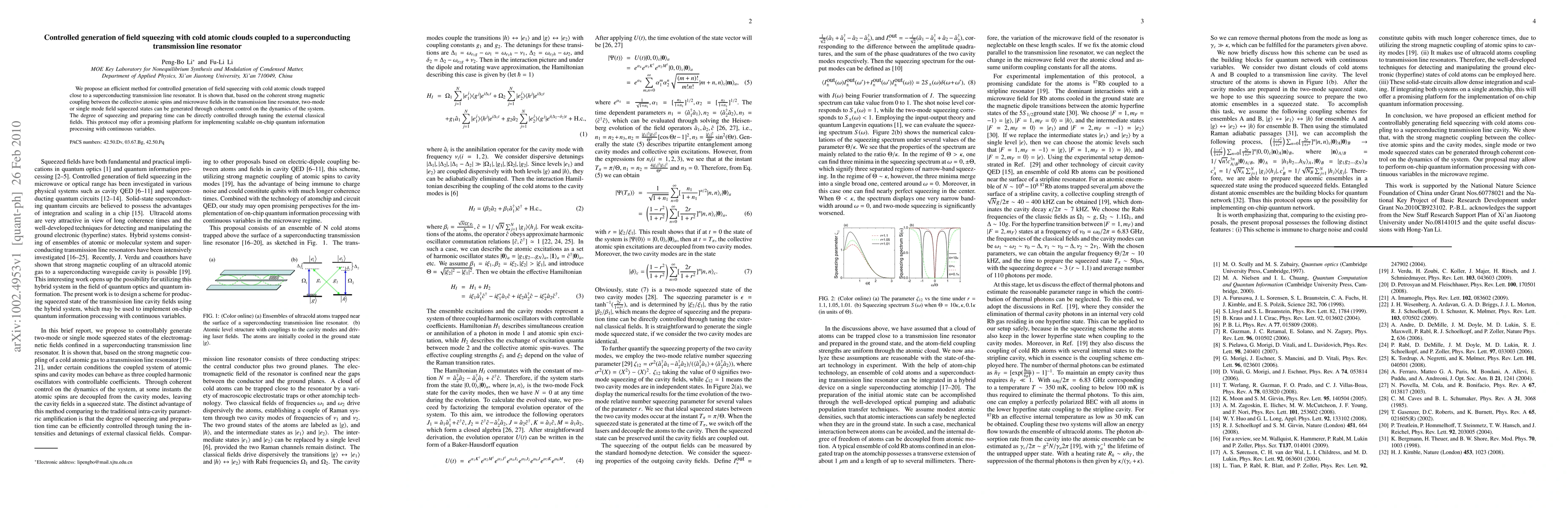 This paper proposes a method for generating field squeezing using cold atomic clouds coupled to a superconducting transmission line resonator, leveraging strong magnetic coupling to produce two-mode or single mode squeezed states. The degree of squeezing and preparation time can be controlled via external classical fields, potentially enabling scalable on-chip quantum information processing.