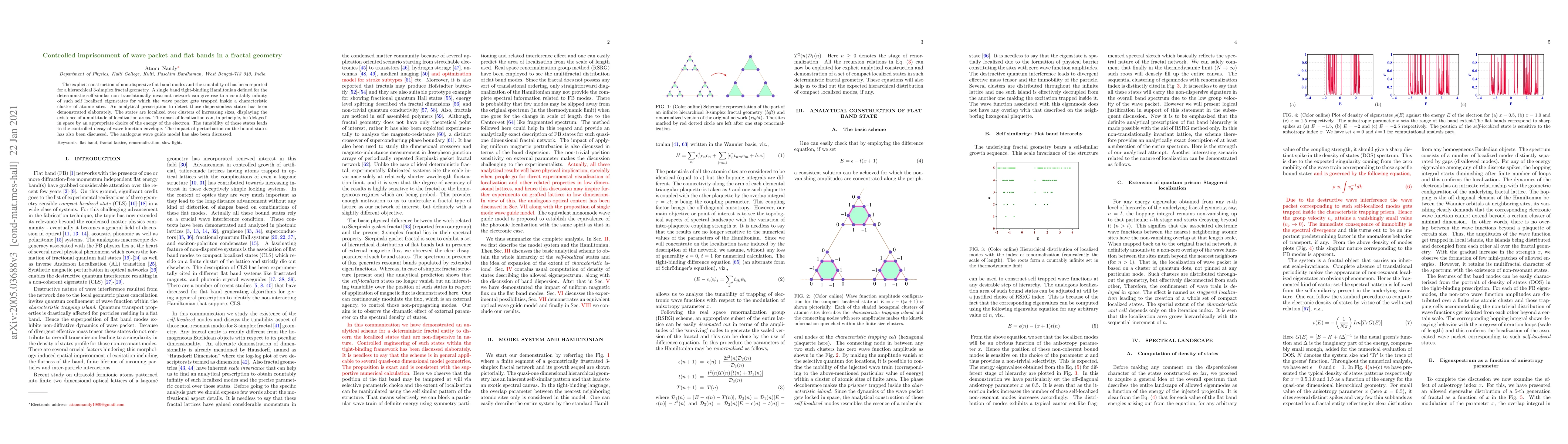 The explicit construction of non-dispersive flat band modes and the tunability of has been reported for a hierarchical 3-simplex fractal geometry. A single band tight binding Hamiltonian defined for the deterministic self-similar non-translationally invariant network can give rise to a countably infinity of such self localized eigenstates for which the wave packet gets trapped inside a characteristic cluster of atomic sites. An analytical prescription to detect those dispersionless states has been demonstrated elaborately. The states are localized over clusters of increasing sizes, displaying the existence of a multitude of localization areas. The onset of localization can, in principle, be delayed in space by an appropriate choice of the energy of the electron. The response of the system with the modulation of the anisotropy parameter is also studied. Supportive calculation of spectral landscape and demonstration of band dispersion plot are presented to solidify the analytical results. Variation of effective mass tensor cites re-entrant behavior with respect to the modulation of off-diagonal anisotropy. The tunability of those states leads to the controlled decay of wave function envelope. The impact of uniform magnetic perturbation on the bound states has also been discussed. Continuous variation of flux modulates the position of the flat band modes. The macroscopic degeneracy associated with the modes is retained with respect to the application of perturbation.