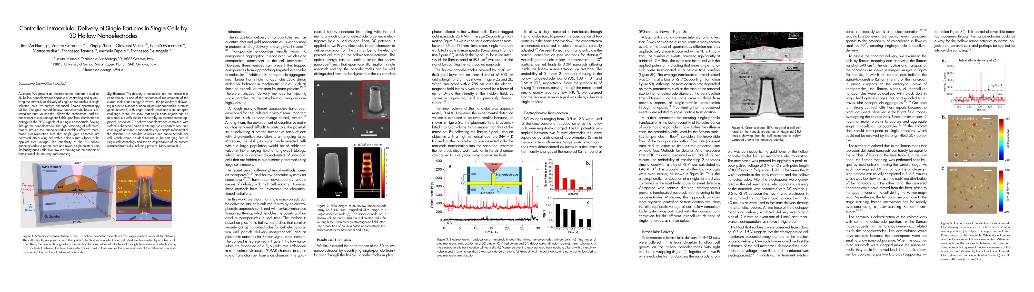 This research introduces a novel electrophoretic platform using 3D hollow nanoelectrodes for precise intracellular delivery of single nanoparticles into single cells, monitored via surface-enhanced Raman spectroscopy. The method employs gold-coated nanoelectrodes to achieve effective membrane electroporation and deliver gold nanorods with controlled rates based on applied voltage.
