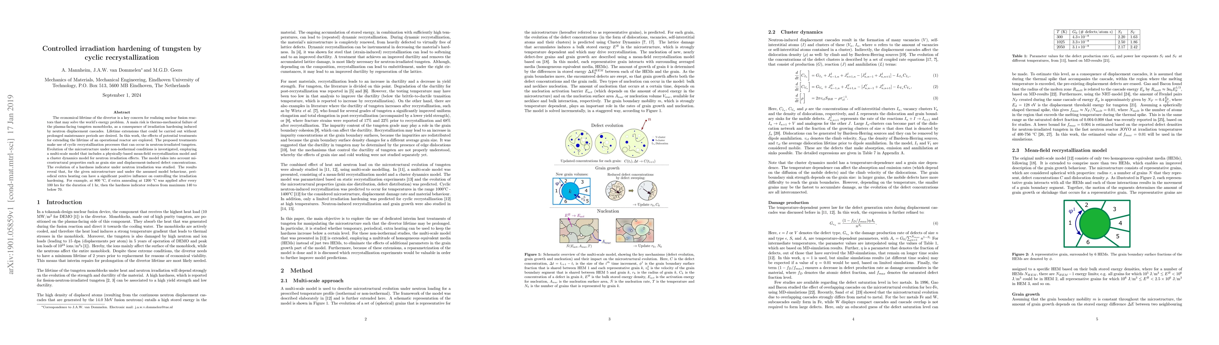 This paper investigates the use of cyclic recrystallization processes to extend the lifetime of tungsten monoblocks in nuclear fusion reactors by controlling irradiation hardening. The study employs a multi-scale model to explore the microstructure evolution under non-isothermal conditions, revealing that periodic extra heating can significantly reduce the hardness indicator, thus mitigating thermo-mechanical failure.
