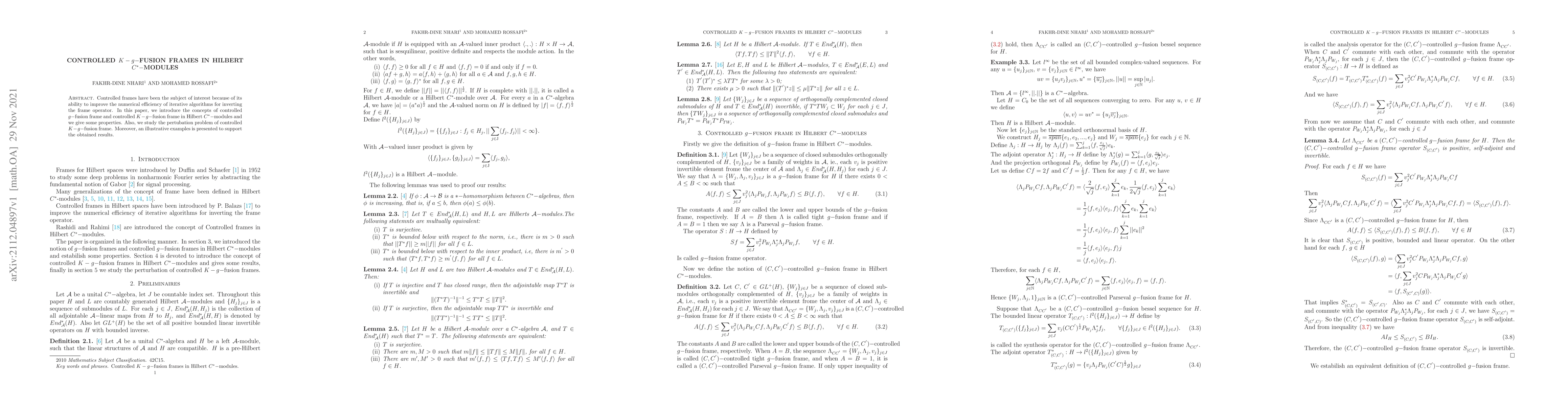 This paper introduces controlled g-fusion frames and controlled K-g-fusion frames in Hilbert C*-modules, discussing their properties and perturbation problems. It also provides examples to demonstrate the theoretical findings.