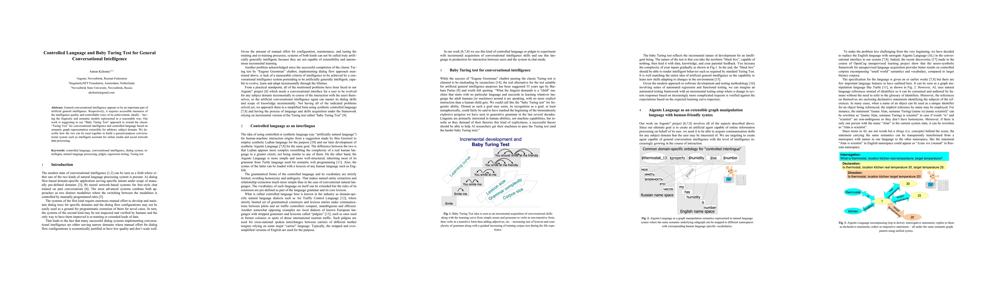 General conversational intelligence appears to be an important part of artificial general intelligence. Respectively, it requires accessible measures of the intelligence quality and controllable ways of its achievement, ideally - having the linguistic and semantic models represented in a reasonable way. Our work is suggesting to use Baby Turing Test approach to extend the classic Turing Test for conversational intelligence and controlled language based on semantic graph representation extensible for arbitrary subject domain. We describe how the two can be used together to build a general-purpose conversational system such as an intelligent assistant for online media and social network data processing.