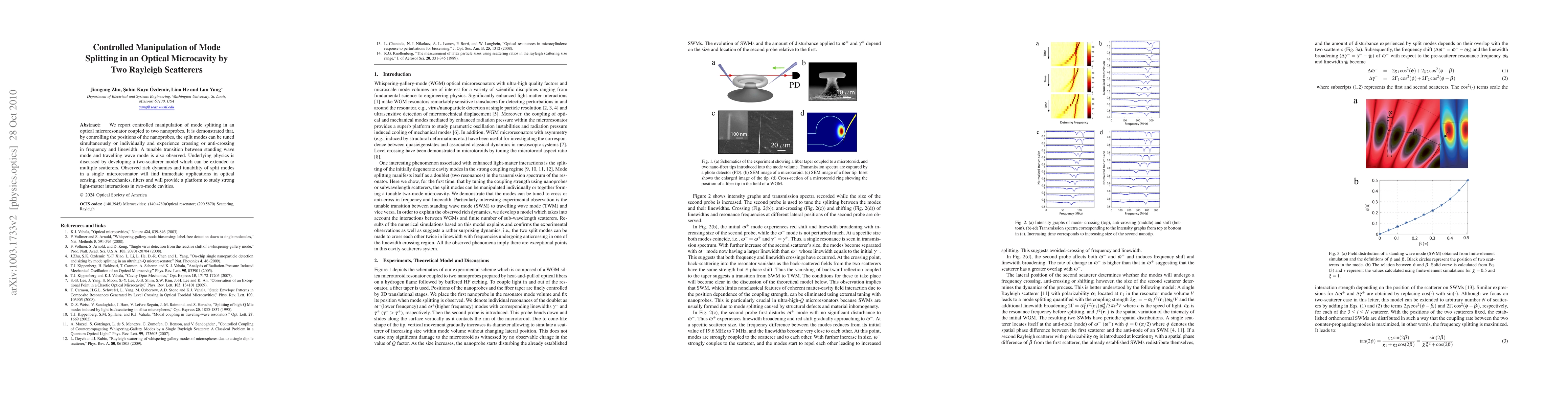 This paper demonstrates controlled manipulation of mode splitting in an optical microcavity using two Rayleigh scatterers, showing tunable transitions between standing and travelling wave modes and rich dynamics. The study provides a two-scatterer model for understanding and extending the effects to multiple scatterers, with potential applications in optical sensing and strong light-matter interactions.