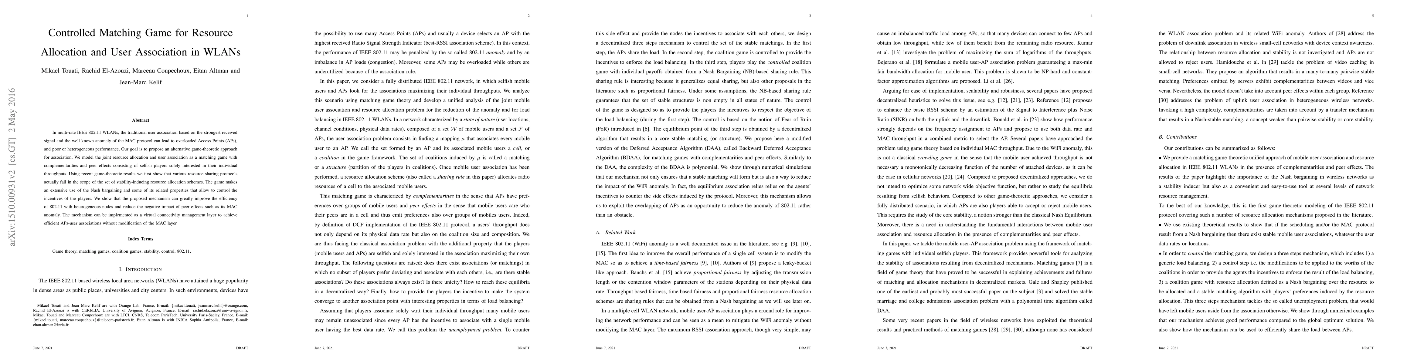 This paper proposes a game-theoretic approach to resource allocation and user association in multi-rate IEEE 802.11 WLANs, aiming to improve efficiency and reduce overloaded Access Points. The method models the problem as a matching game, leveraging Nash bargaining to control player incentives and enhance throughput.