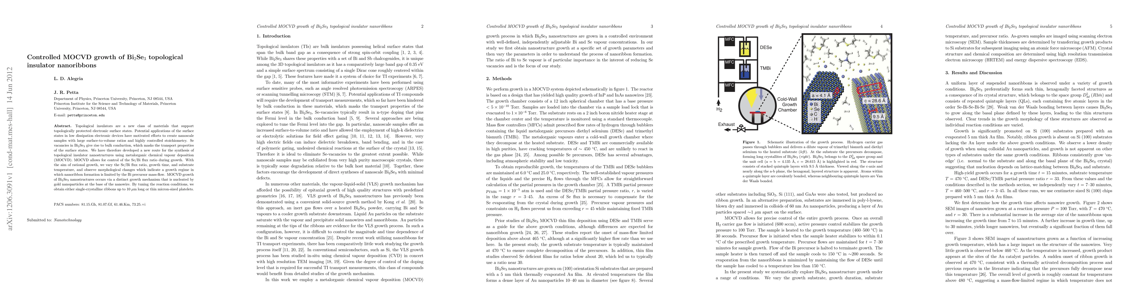 Topological insulators are a new class of materials that support topologically protected electronic surface states. Potential applications of the surface states in low dissipation electronic devices have motivated efforts to create nanoscale samples with large surface-to-volume ratios and highly controlled stoichiometry. Se vacancies in Bi2Se3 give rise to bulk conduction, which masks the transport properties of the surface states. We have therefore developed a new route for the synthesis of topological insulator nanostructures using metalorganic chemical vapour deposition (MOCVD). MOCVD allows for control of the Se/Bi flux ratio during growth. With the aim of rational growth, we vary the Se/Bi flux ratio, growth time, and substrate temperature, and observe morphological changes which indicate a growth regime in which nanoribbon formation is limited by the Bi precursor mass-flow. MOCVD growth of Bi2Se3 nanostructures occurs via a distinct growth mechanism that is nucleated by gold nanoparticles at the base of the nanowire. By tuning the reaction conditions, we obtain either single-crystalline ribbons up to 10 microns long or thin micron-sized platelets.