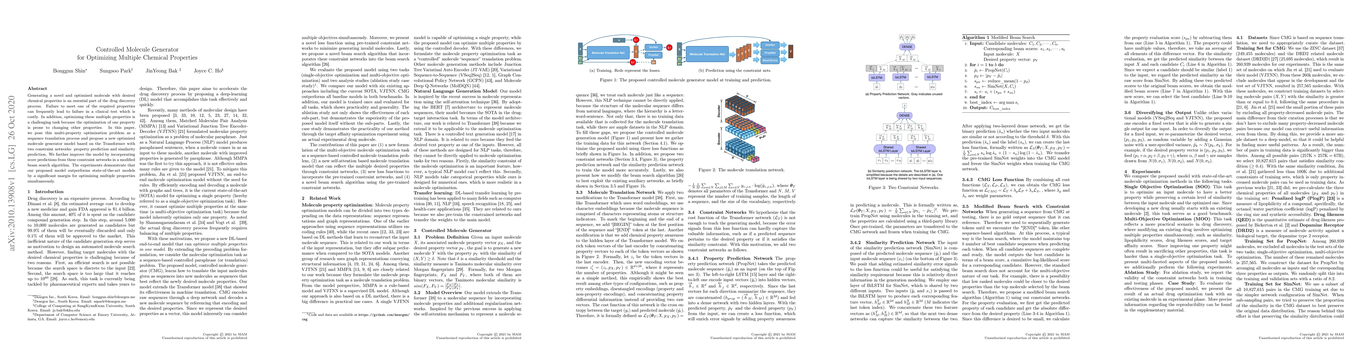 This paper introduces a novel Transformer-based molecule generator model with two constraint networks for optimizing multiple chemical properties in drug discovery. The model outperforms existing methods, demonstrating significant improvements in simultaneous property optimization.