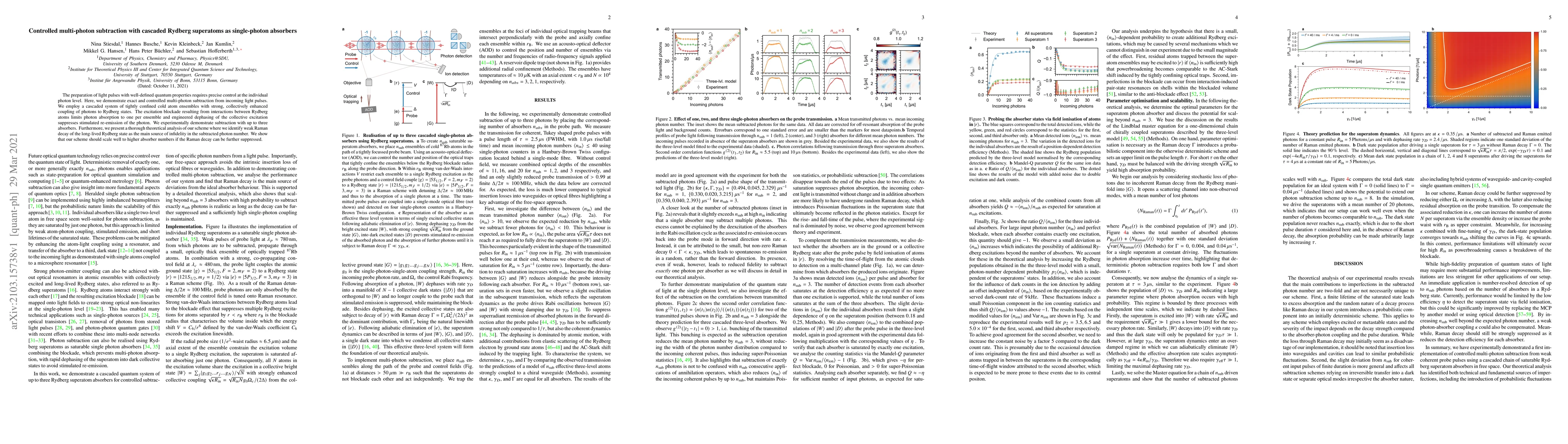 This paper demonstrates controlled multi-photon subtraction using a cascaded system of Rydberg superatoms, ensuring single-photon absorption per ensemble. The study identifies Raman decay as the main source of error and suggests scalability to higher absorber numbers with improved decay suppression.