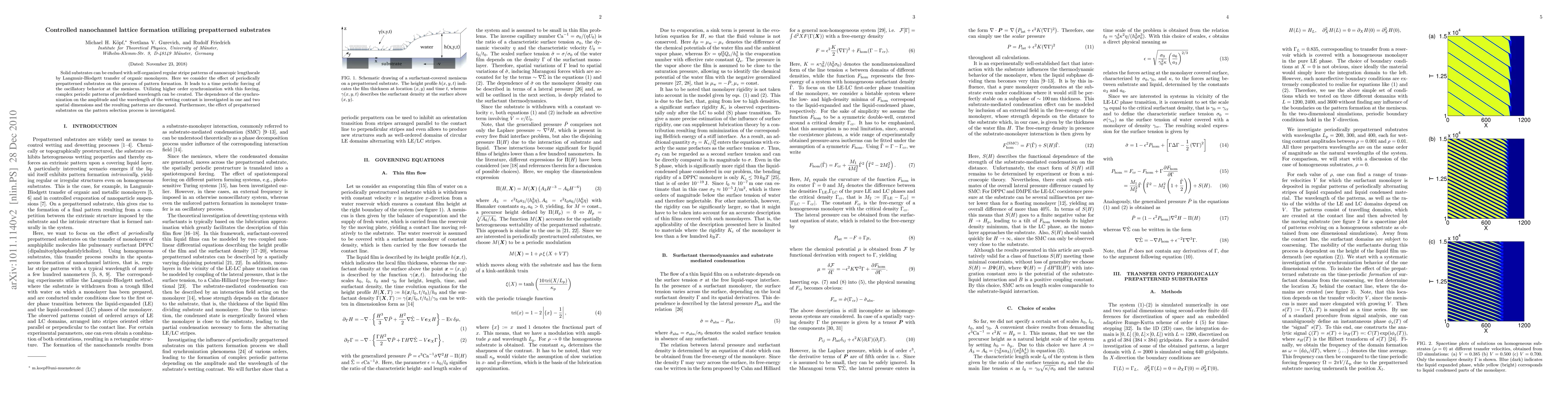 This paper explores the formation of controlled nanochannel lattices using prepatterned substrates through Langmuir-Blodgett transfer, revealing how periodic substrate patterns influence the synchronization of meniscus oscillations to create complex periodic patterns of specific wavelengths. The study investigates the dependency of this synchronization on the wetting contrast amplitude and wavelength in both one and two spatial dimensions.