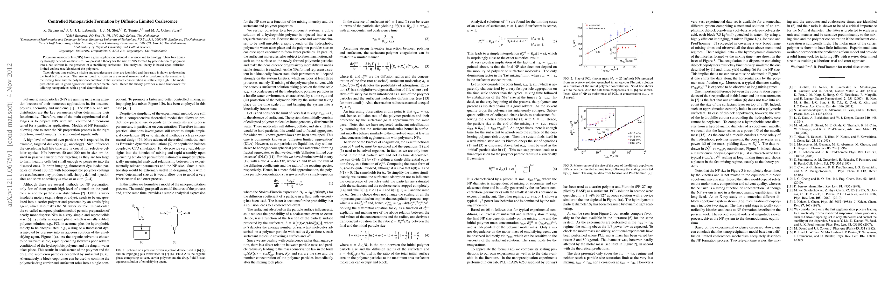 This paper presents a theoretical framework for controlling the size of polymeric nanoparticles formed via diffusion-limited coalescence in a bad solvent with a stabilizing surfactant. The model identifies two key time scales, mixing and coalescence, whose ratio determines the final nanoparticle diameter, providing a universal scaling relationship sensitive to mixing time and polymer concentration.
