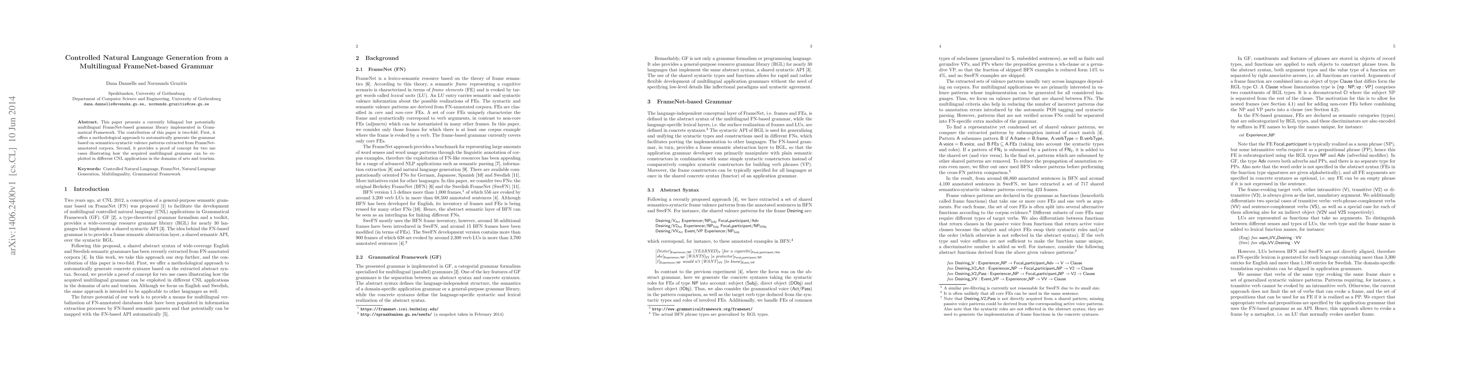 This paper introduces a bilingual FrameNet-based grammar library in Grammatical Framework, utilizing FrameNet to automatically generate the grammar. It also demonstrates its application in CNL systems for arts and tourism domains.