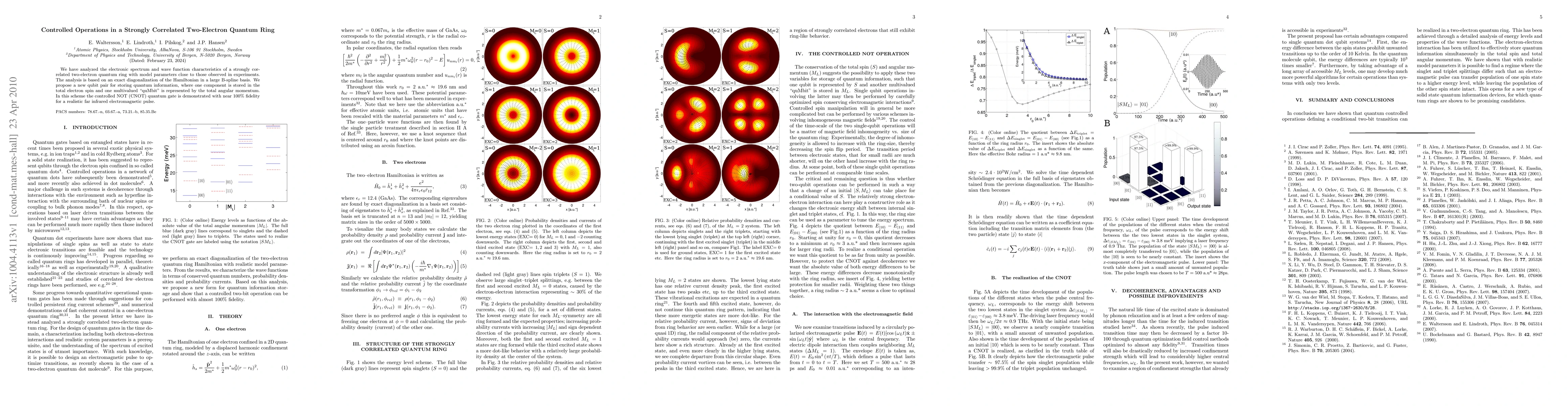 This paper investigates the electronic spectrum and wave functions of a strongly correlated two-electron quantum ring, proposing a new qubit pair for quantum information storage using electron spin and angular momentum. The controlled NOT (CNOT) quantum gate is demonstrated with high fidelity using a realistic far infrared pulse.