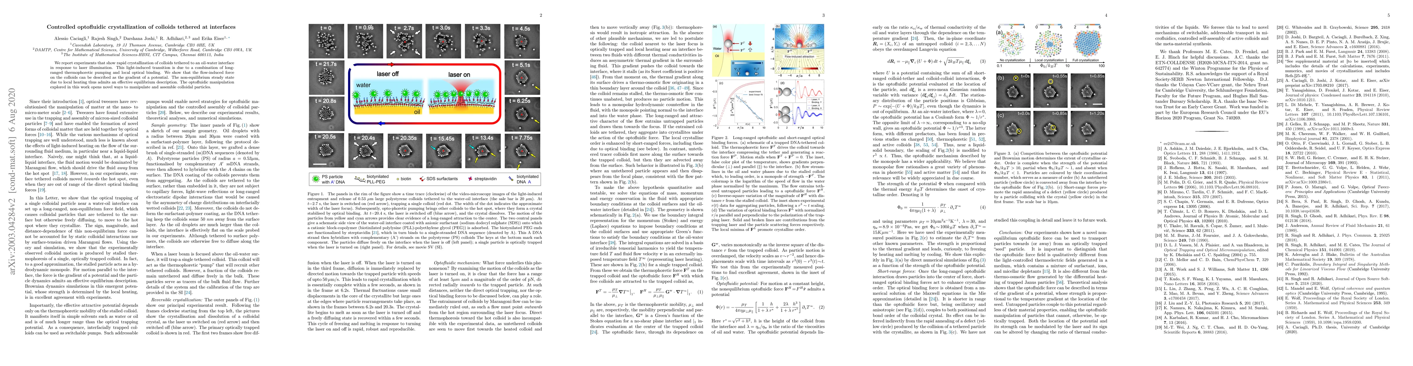This study demonstrates the rapid crystallization of colloids at an oil-water interface under laser illumination, driven by thermophoretic and optical binding effects. The findings suggest an effective equilibrium description of the nonequilibrium steady state, highlighting new optofluidic methods for colloidal manipulation and assembly.