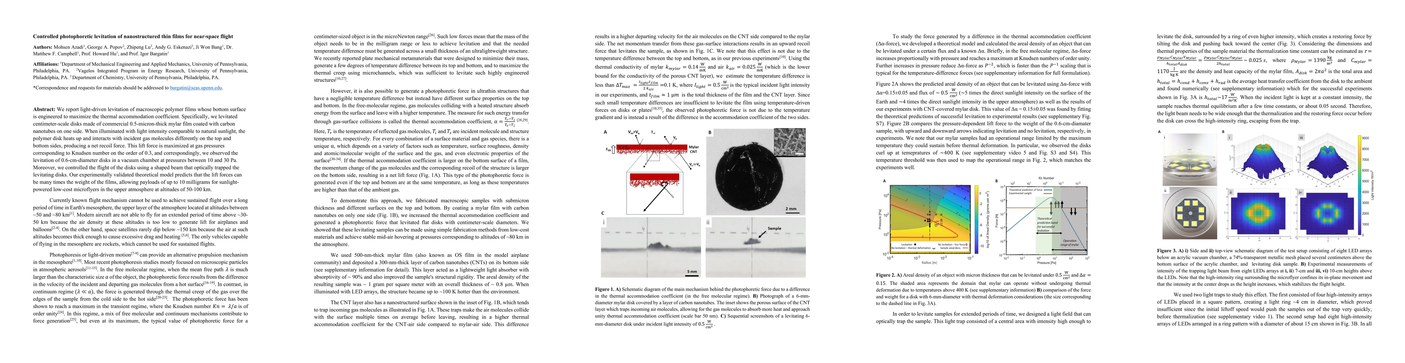 This paper details the controlled photophoretic levitation of thin, nanostructured polymer films using light-driven thermal forces, achieving centimeter-scale levitation in low-pressure environments. The study demonstrates potential for low-cost, sunlight-powered microflyers in near-space flight.