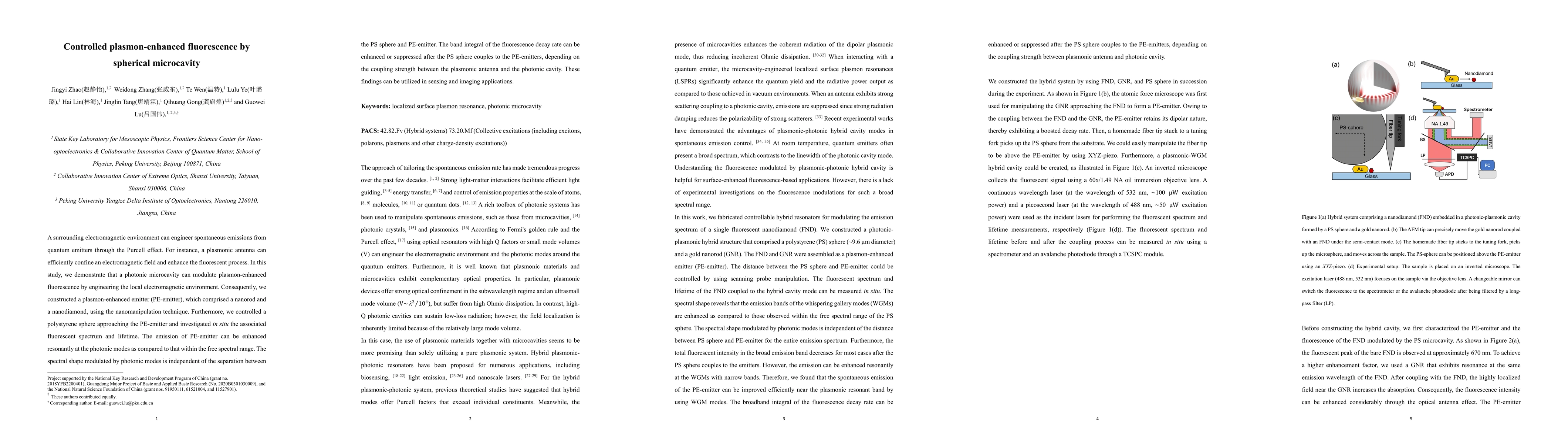 A surrounding electromagnetic environment can engineer spontaneous emissions from quantum emitters through the Purcell effect. For instance, a plasmonic antenna can efficiently confine an electromagnetic field and enhance the fluorescent process. In this study, we demonstrate that a photonic microcavity can modulate plasmon-enhanced fluorescence by engineering the local electromagnetic environment. Consequently, we constructed a plasmon-enhanced emitter (PE-emitter), which comprised a nanorod and a nanodiamond, using the nanomanipulation technique. Furthermore, we controlled a polystyrene sphere approaching the PE-emitter and investigated in situ the associated fluorescent spectrum and lifetime. The emission of PE-emitter can be enhanced resonantly at the photonic modes as compared to that within the free spectral range. The spectral shape modulated by photonic modes is independent of the separation between the PS sphere and PE-emitter. The band integral of the fluorescence decay rate can be enhanced or suppressed after the PS sphere couples to the PE-emitters, depending on the coupling strength between the plasmonic antenna and the photonic cavity. These findings can be utilized in sensing and imaging applications.