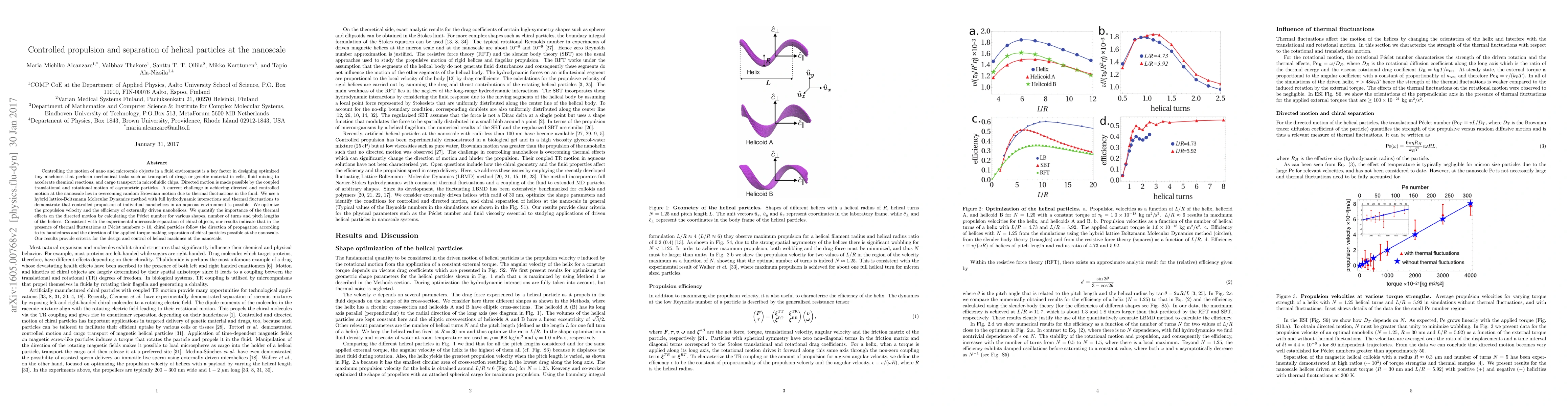 This paper demonstrates controlled propulsion and separation of nanoscale helical particles using a hybrid lattice-Boltzmann Molecular Dynamics method. It shows that thermal effects can be managed to achieve directed motion and separation of chiral particles, providing criteria for designing nanoscale helical machines.