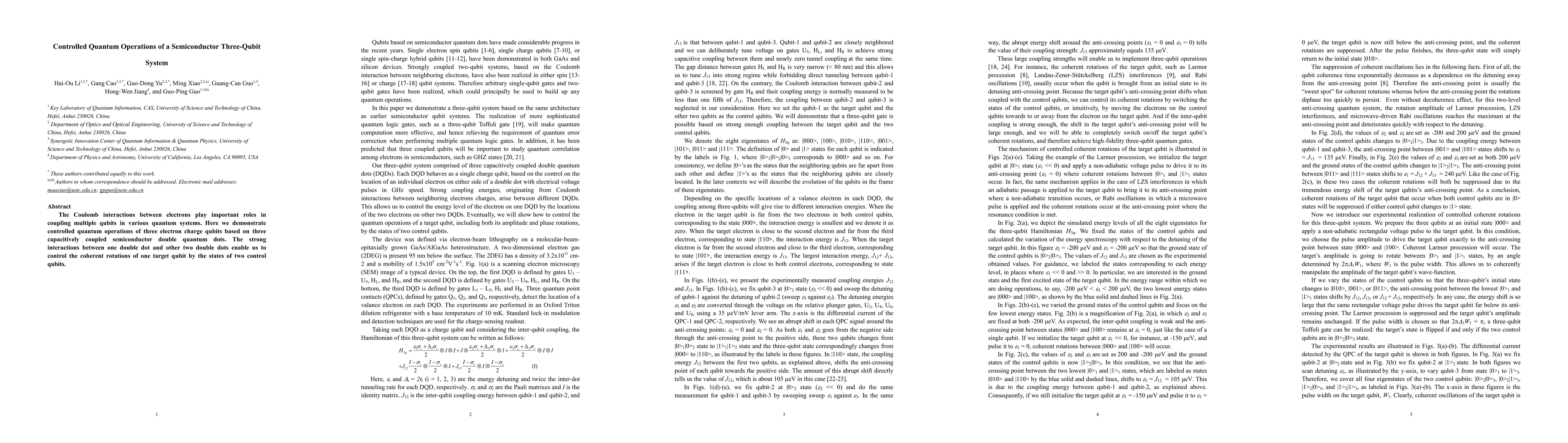 This paper demonstrates controlled quantum operations in a three-qubit semiconductor system using capacitively coupled double quantum dots, leveraging Coulomb interactions to manipulate the coherent rotations of a target qubit via two control qubits. The study highlights the potential of these interactions for advanced quantum computing.