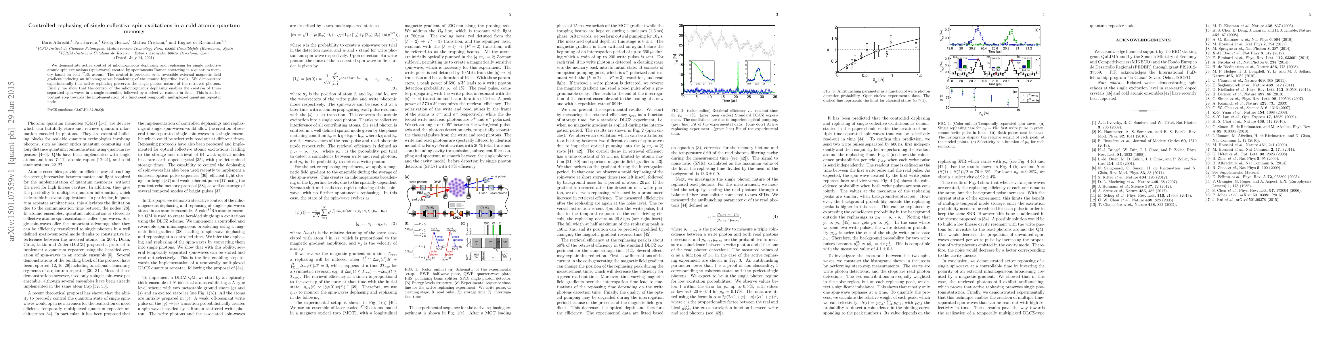 This paper demonstrates active control over inhomogeneous dephasing and rephasing of single collective spin-wave excitations in a cold $^{87}$Rb atomic quantum memory, using a reversible magnetic field gradient. The study shows that active rephasing preserves the single-photon nature of retrieved photons and enables the creation of time-separated spin-waves for selective readout, advancing the development of a temporally multiplexed quantum repeater node.