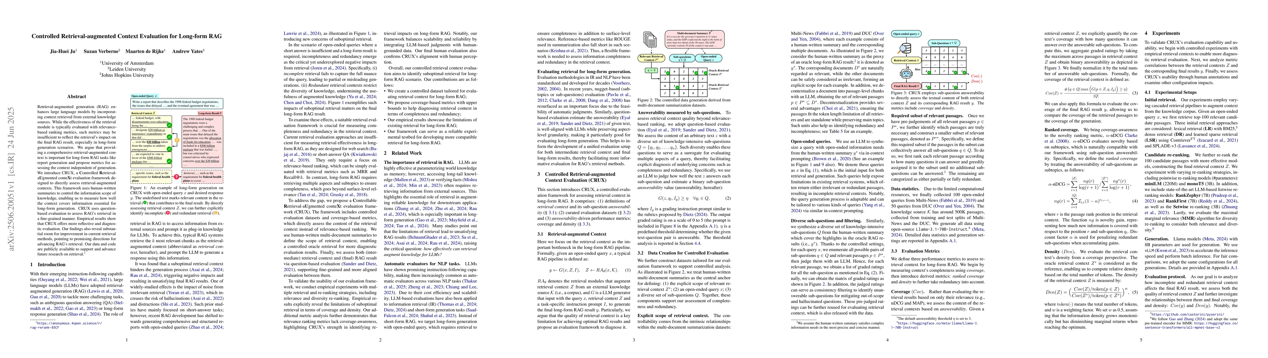The paper introduces CRUX, a framework for evaluating retrieval-augmented contexts in long-form generation tasks like report creation. CRUX uses human-written summaries to control information scope and question-based evaluation for fine-grained assessment. Results indicate CRUX provides more insightful evaluation, revealing significant potential for improving retrieval methods in RAG systems.