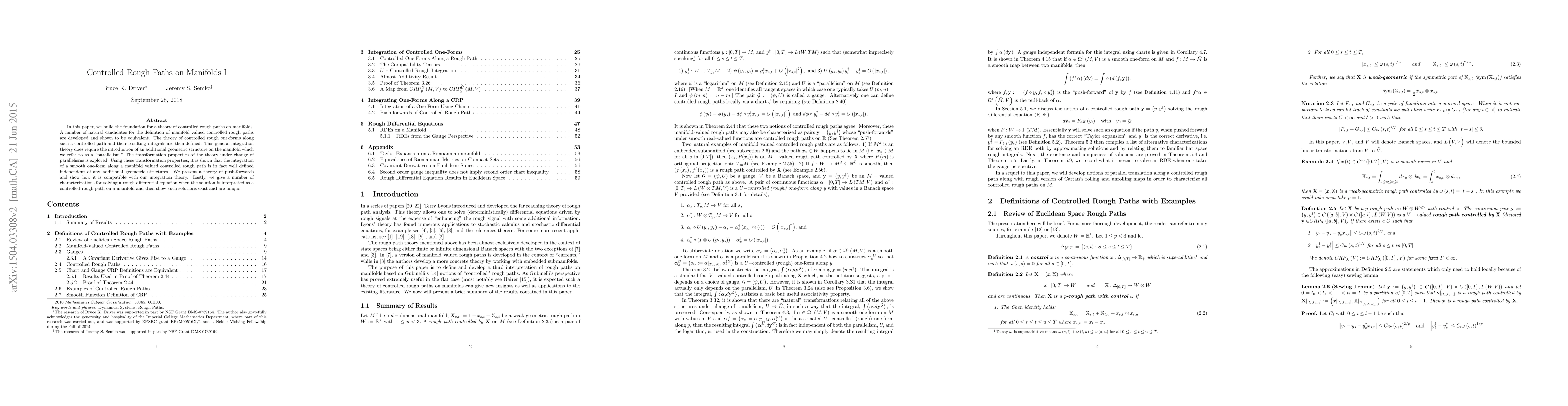 In this paper, we build the foundation for a theory of controlled rough paths on manifolds. A number of natural candidates for the definition of manifold valued controlled rough paths are developed and shown to be equivalent. The theory of controlled rough one-forms along such a controlled path and their resulting integrals are then defined. This general integration theory does require the introduction of an additional geometric structure on the manifold which we refer to as a "parallelism." The transformation properties of the theory under change of parallelisms is explored. Using these transformation properties, it is shown that the integration of a smooth one-form along a manifold valued controlled rough path is in fact well defined independent of any additional geometric structures. We present a theory of push-forwards and show how it is compatible with our integration theory. Lastly, we give a number of characterizations for solving a rough differential equation when the solution is interpreted as a controlled rough path on a manifold and then show such solutions exist and are unique.