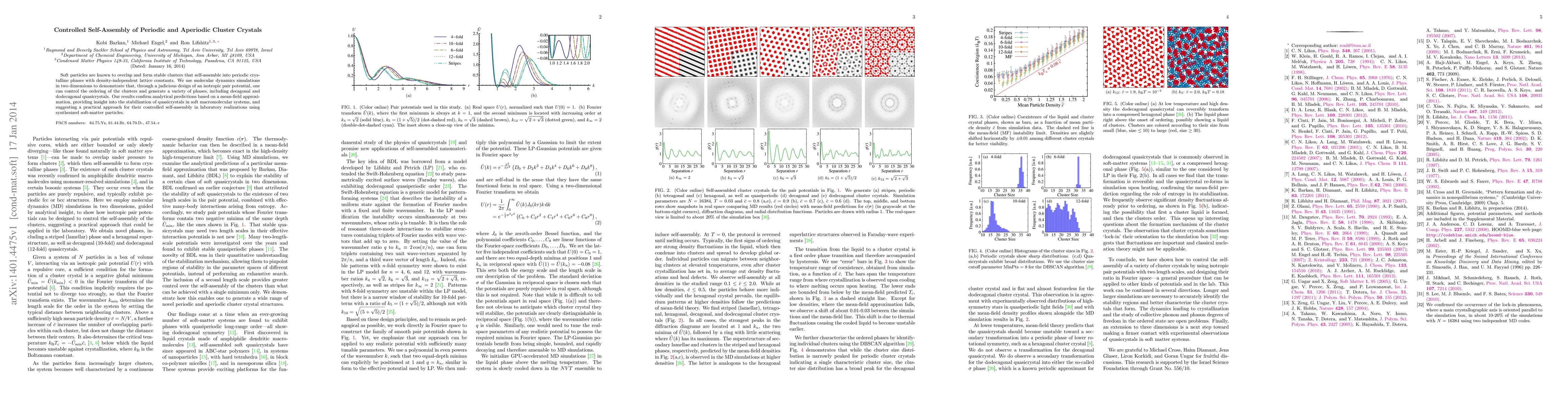 This paper demonstrates the controlled self-assembly of periodic and aperiodic cluster crystals using molecular dynamics simulations. It shows that by designing an isotropic pair potential, various phases, including quasicrystals, can be generated, confirming analytical predictions and suggesting a method for their practical synthesis in soft-matter systems.