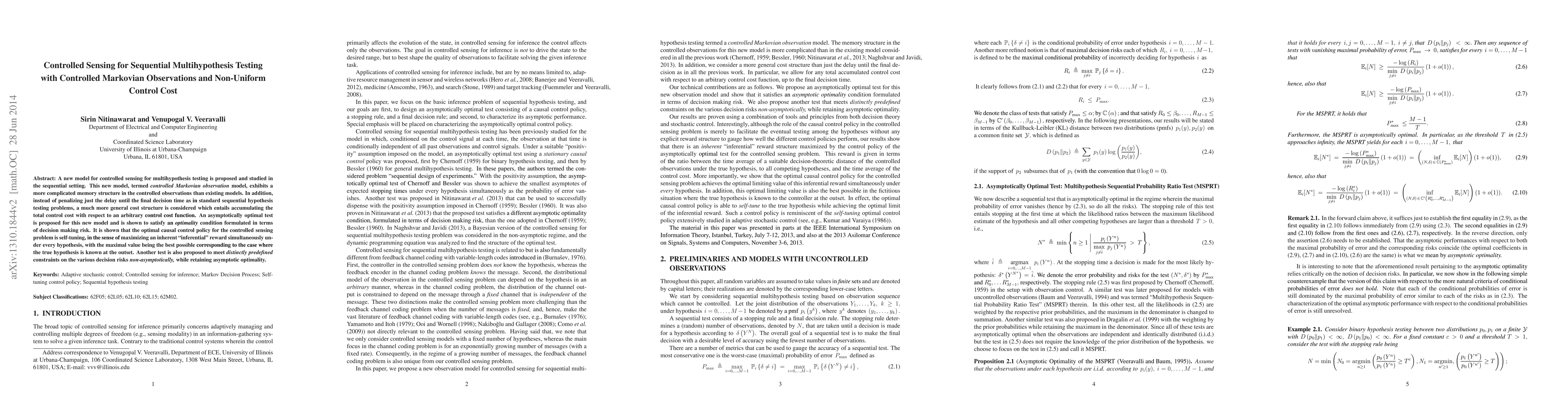 A new model for controlled sensing for multihypothesis testing is proposed and studied in the sequential setting. This new model, termed {\em controlled Markovian observation} model, exhibits a more complicated memory structure in the controlled observations than existing models. In addition, instead of penalizing just the delay until the final decision time as in standard sequential hypothesis testing problems, a much more general cost structure is considered which entails accumulating the total control cost with respect to an arbitrary control cost function. An asymptotically optimal test is proposed for this new model and is shown to satisfy an {\em optimality} condition formulated in terms of decision making risk. It is shown that the optimal causal control policy for the controlled sensing problem is self-tuning, in the sense of maximizing an inherent "inferential" reward simultaneously under every hypothesis, with the maximal value being the best possible corresponding to the case where the true hypothesis is known at the outset. Another test is also proposed to meet {\em distinctly predefined} constraints on the various decision risks {\em non-asymptotically,} while retaining asymptotic optimality.