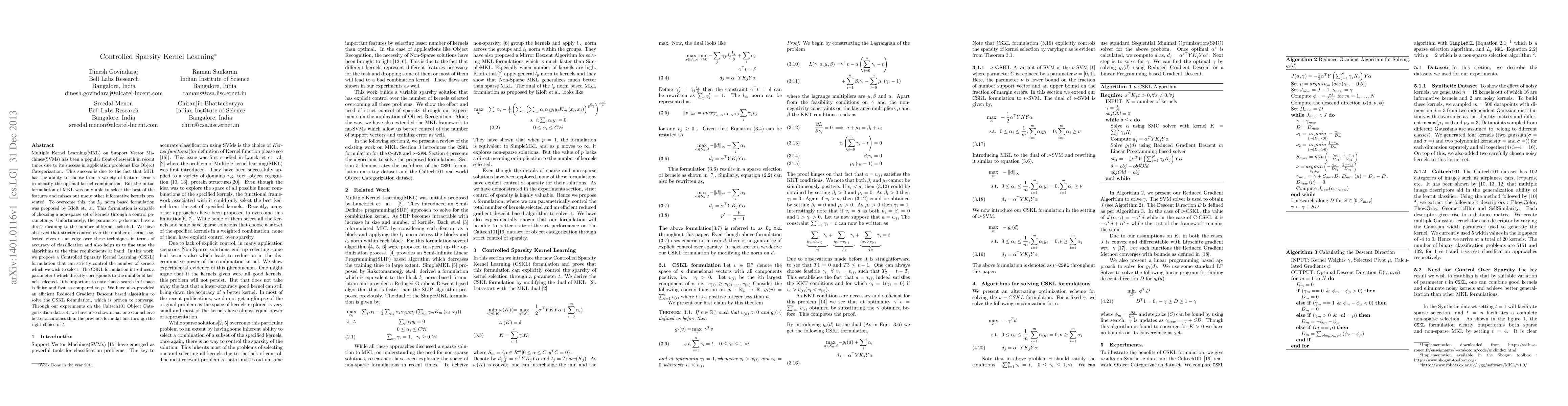 This paper proposes a Controlled Sparsity Kernel Learning (CSKL) formulation to improve Multiple Kernel Learning (MKL) on Support Vector Machines (SVMs) by strictly controlling the number of selected kernels through a parameter t, which directly correlates to kernel selection count. An efficient Reduced Gradient Descent algorithm is provided for solving the CSKL formulation, demonstrating improved classification accuracy on the Caltech101 dataset compared to previous methods.